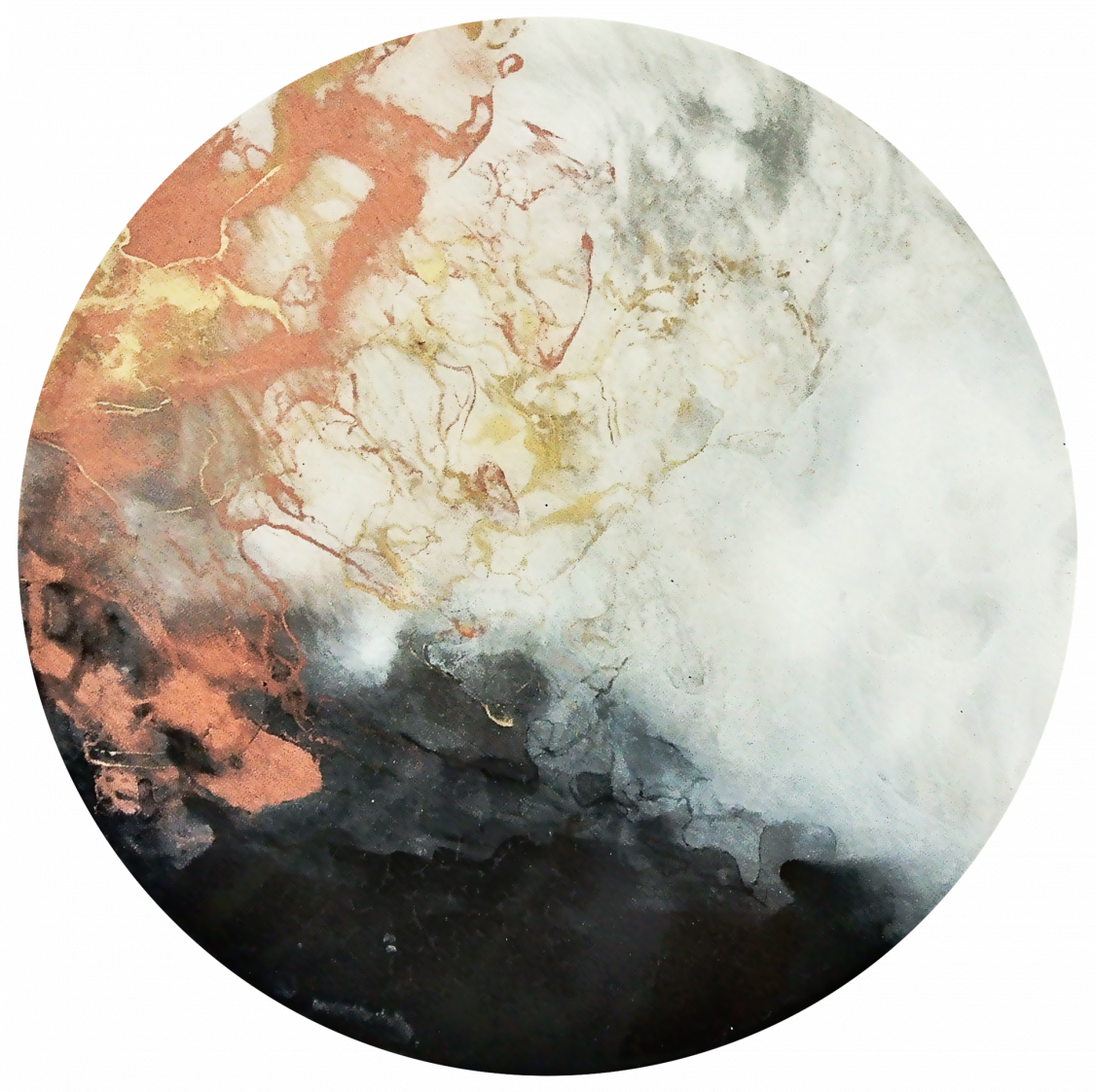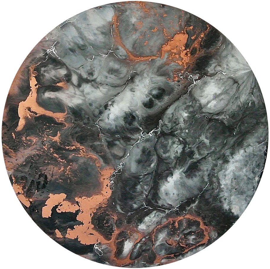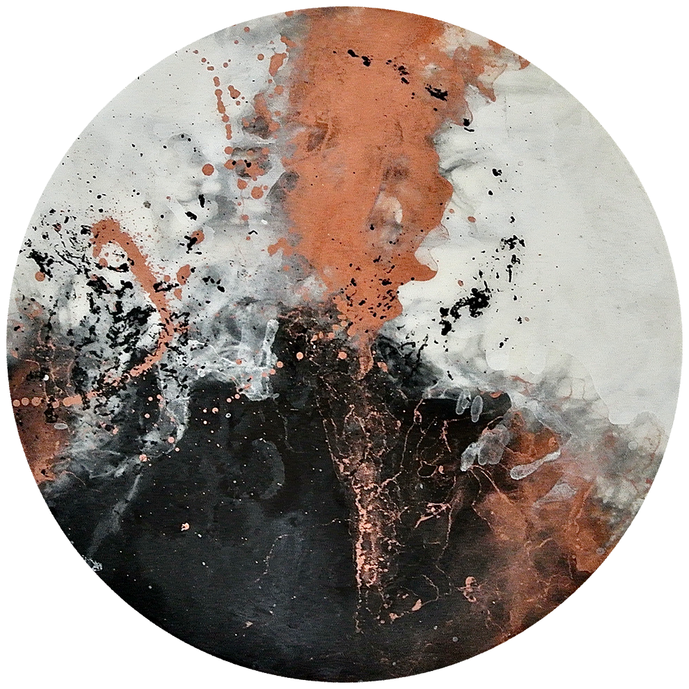 Die Bilder von Natalie Hayn erinnern an eisenhaltige Schlacken, ausgeworfen aus Vulkanschloten. Der Feuerring um die Erde, mit all seinen „Feuerbergen“,… die Schönheit der Urgewalten wird veranschaulicht. Mal in Kunstharz gegossen, mal mit Alkoholtinte nachempfunden, immer aber mit der Besonderheit, dass fluide, fließfähige Phasen am Anfang stehen.