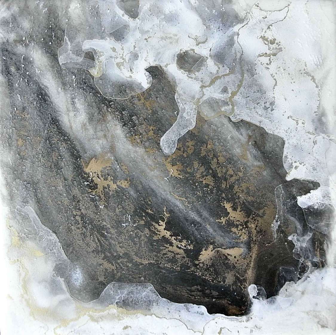 Der unvergleichliche, unverwechselbare Glanz von Resin reizt viele Künstler mit Harz zu arbeiten und ihre Bilder aus der Masse der althergebrachten Leinwandarbeiten hervorstechen zu lassen. Natalie Hayn aber vollbringt das Kunststück aus den Arbeiten etwas herauszuholen, was so vielleicht nicht all zu oft gelingt: Geologische Strukturen und Muster entstehen zu lassen. Da das Fließen eine gewisse Eigendynamik hat, ist das Ergebnis der Arbeiten oft scheinbar willkürlich. Jetzt gilt es das Harz dazu zu bringen, den gewünschten Effekt zu erzielen. Wie kann man eine fließfähige Phase dazu bringen bestimmte Muster zu bilden? Und lassen sich die Muster bei der Trocknung einfrieren, oder muss man immer wieder nacharbeiten, immer wieder die Rahmenbedingungen verändern, um das Bild quasi einzufrieren?
