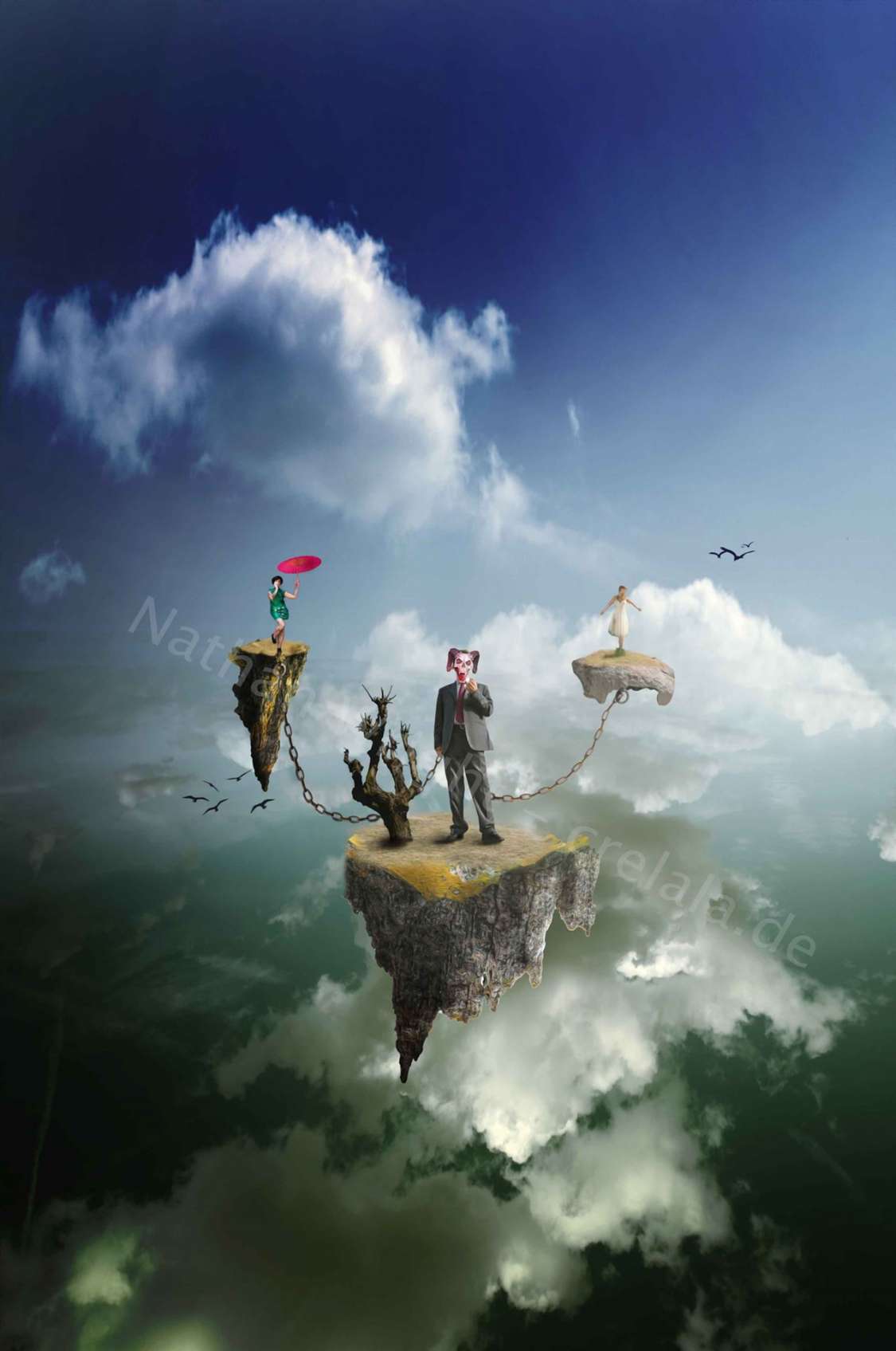 Die Kette als Gestaltungselement hat Nathan Wright auch bei seinem Businessman verwendet. Hier sind es keine Blöcke sondern Gesteinseinheiten, die wie „ausgerissene“ Gebirgselemente, Berggrate, Gebirgsmassive in der Wolken-verdichteten Atmosphäre schweben. Eine menschlich anmutende Gestalt mit totem Widderkopf hält die Ketten. Und auf den einzelnen Inseln: Träume von Weiblichkeit. Mal unschuldig in Weiß, elfengleich als Feen-Ballerina, in tief ausgeschnittenem Kleid, mal aufreizend im grün-engen Minikleid, hoch geschlossen, mit rotem Schirm. Natur und Grünes sind nicht zu sichten in den Wolken und die Gesteine scheinen in ein Fließen überzugehen.