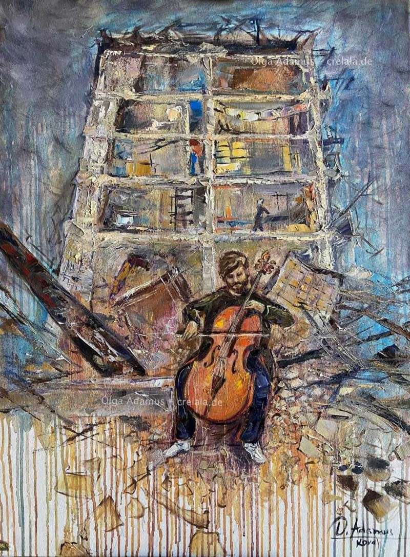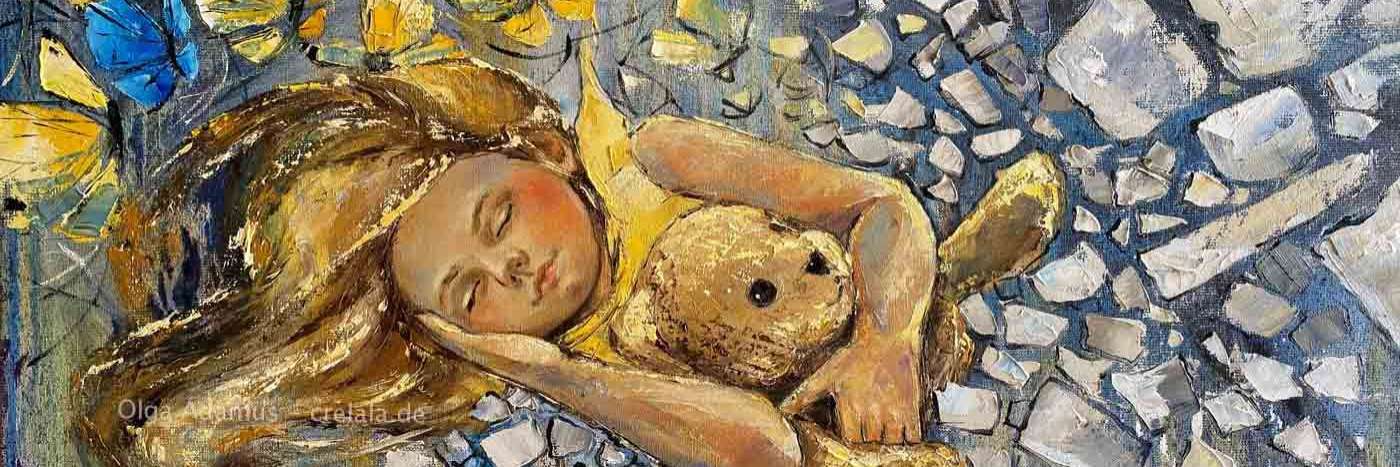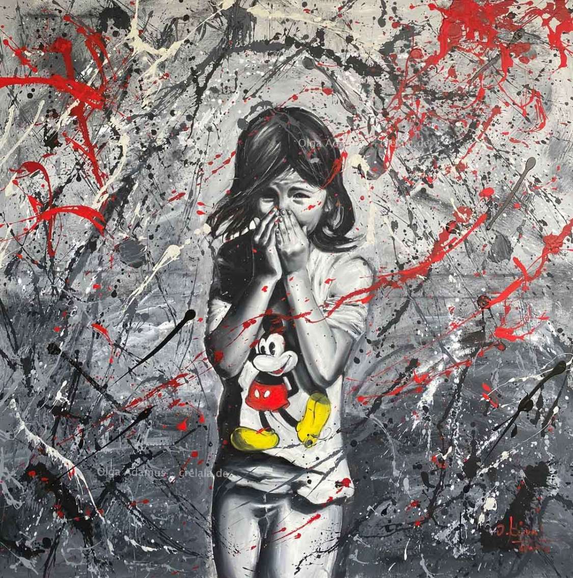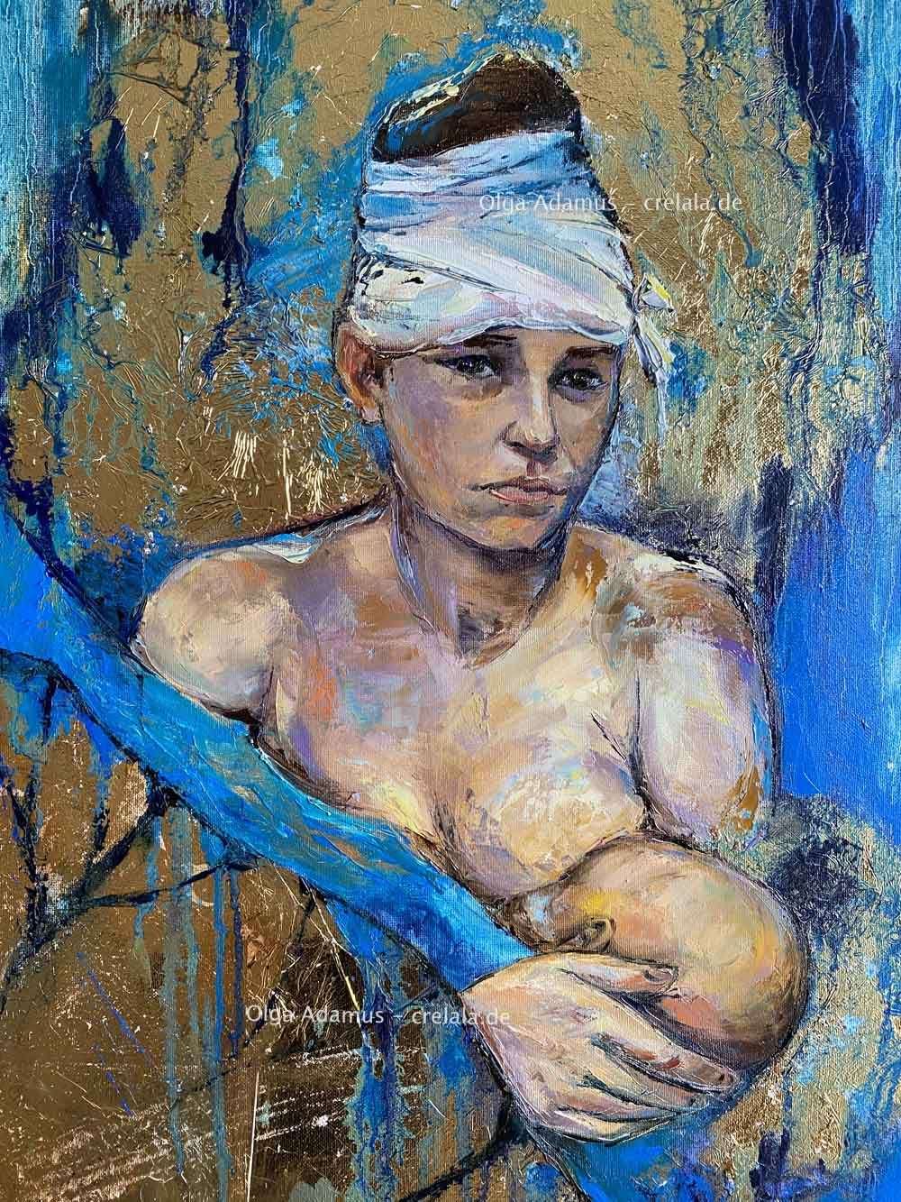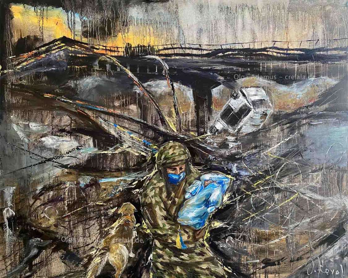 Seit Anfang Februar 2022 wird intensiv über einen der unzähligen Kriege in dieser Welt berichtet. Über den Krieg in der Ukraine. Olga Adamus offenbart ihre Gedanken dazu in der Malerei. Die Künstlerin wurde geboren in Kiev. Sie hatte Glück. Sie lebt heute in München. Seit 2018! Sie konnte das Land verlassen zu einer Zeit, als es in dem Land noch Hoffnung gab. Trotz der Besonderheit einer bewegten Vergangenheit und der Altlasten, die aus einer Zeit nachwirken, als die Medien der Welt noch von Eisernem Vorhang und von Kaltem Krieg berichteten. In Olga Adamus aktuellen Werken geht es um die Scherben, die hinterlassen werden in einem Krieg. Traumatisierung und fragmentierte Wirklichkeit. Zerstörung von Seelen innerhalb eines Systems, das keinen Raum lässt für Menschlichkeit.