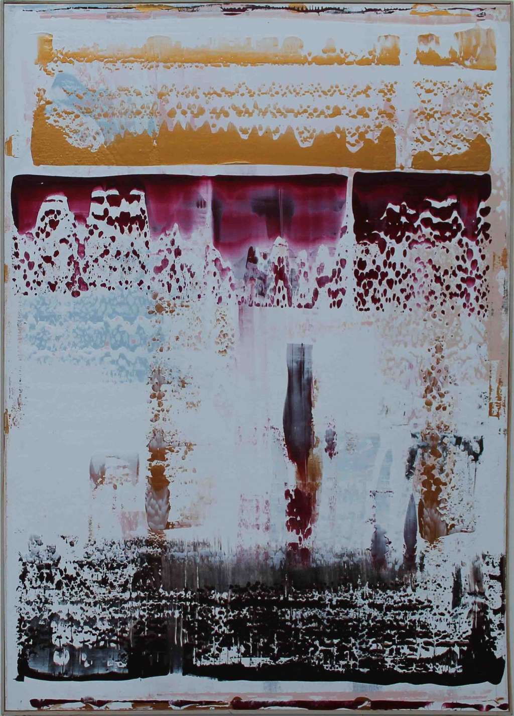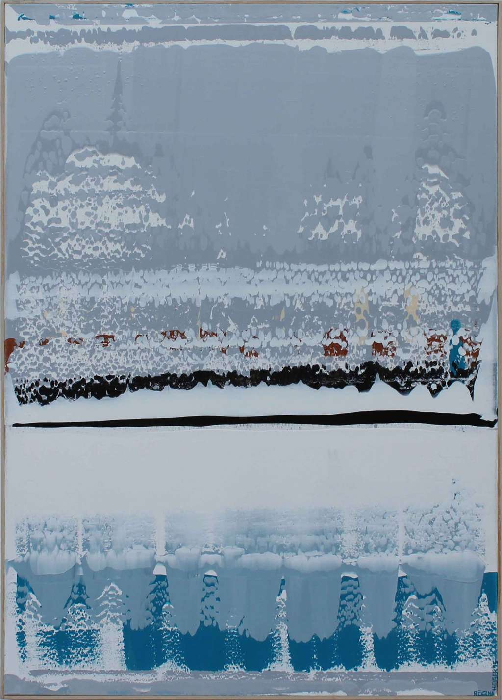 Mit der früheren Werks-Serie „Under Cover“ hat Regina Heiser mit dem Rakel die „Unterschicht“ freigelegt, indem sie mit neuen Schichten darüber die Unterschicht überarbeitet hat.
