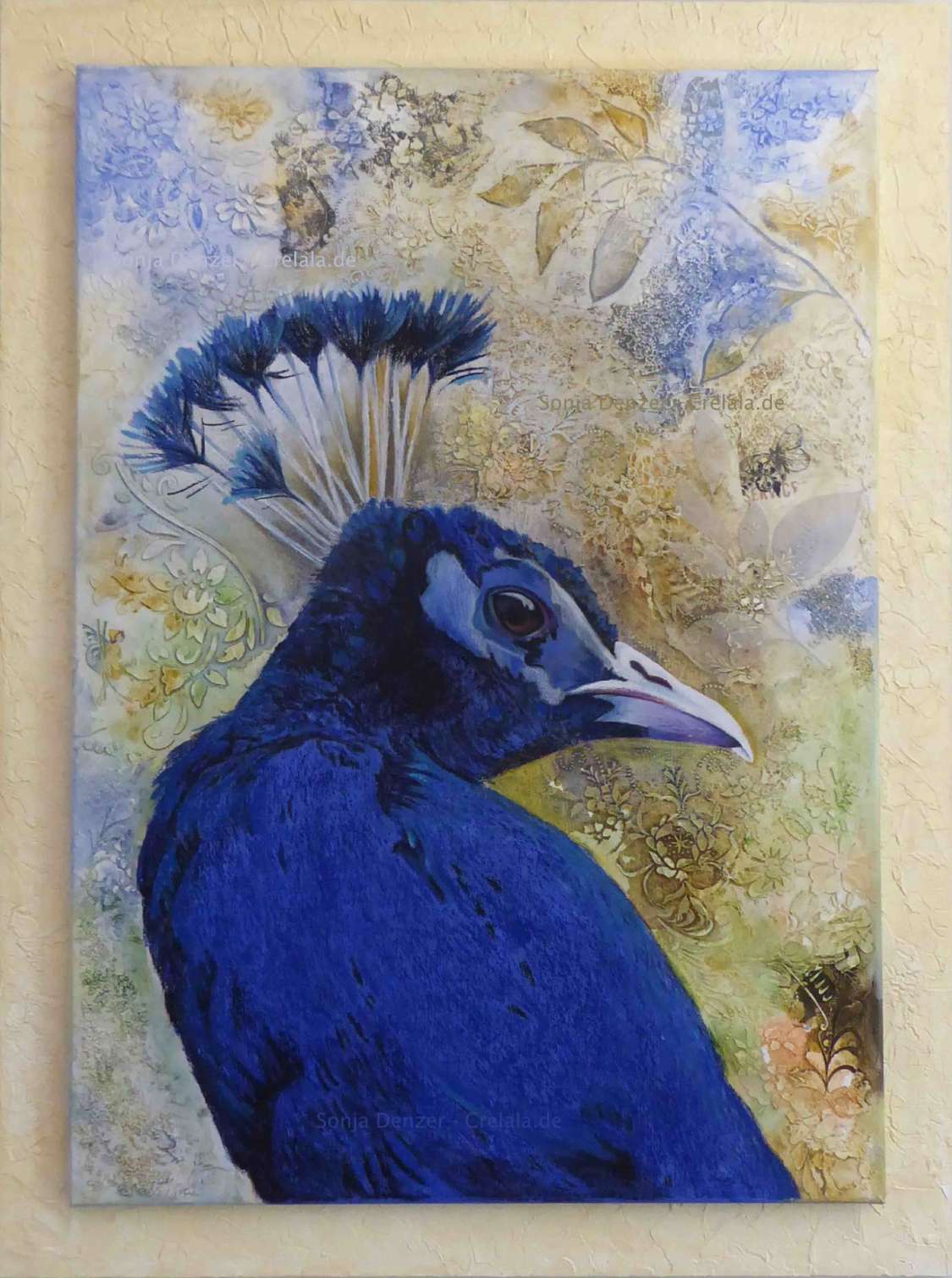 Blau in den verschiedensten Schattierungen, von indigo über azur bis hin zu preußisch Blau ist alles dabei. Die Kraft des Blau überstrahlt auch das Auge des Pfaus.