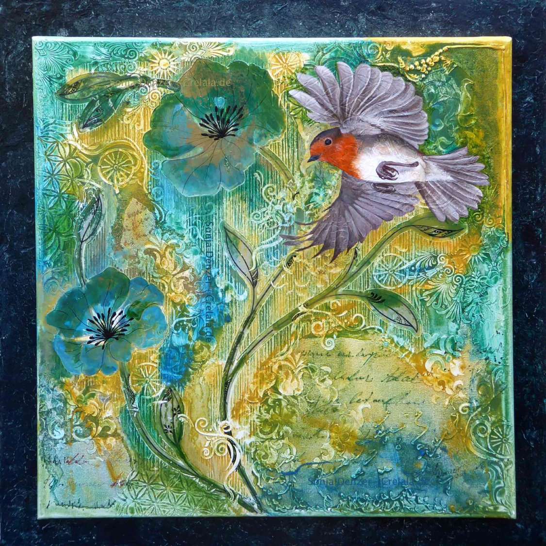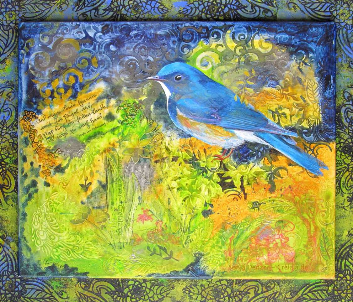 Druckwerk, besonderes Rahmengewerk, über den Rand hinaus gedacht, erweitert und in den Raum geöffnet, expandiert, dem Universum gefolgt, überlässt Sonja Denzer den Betrachter einer malerischen Naturanschauung, in der sie vor allem den gefiederten Arten einen besonderen Platz einräumt.
