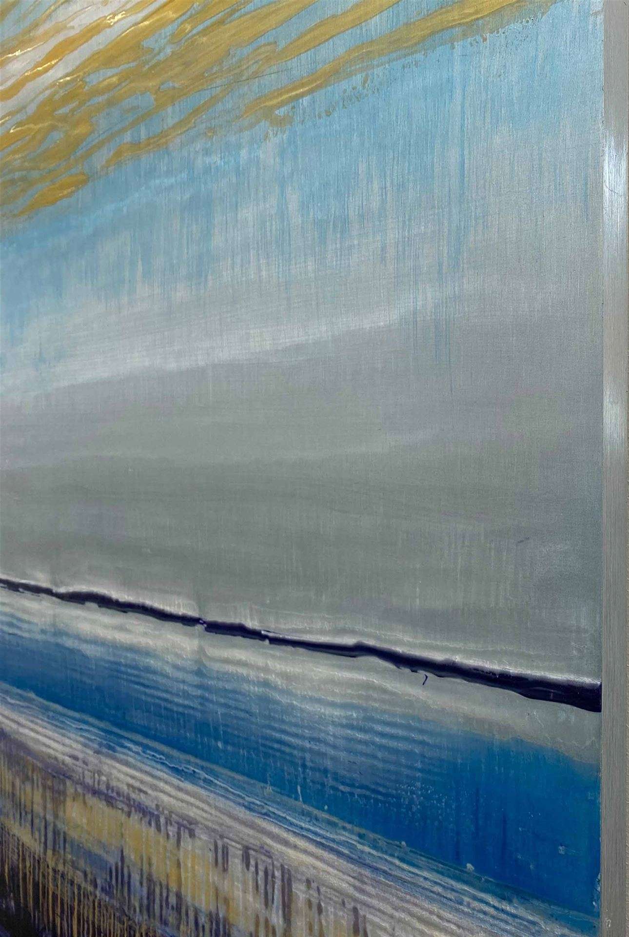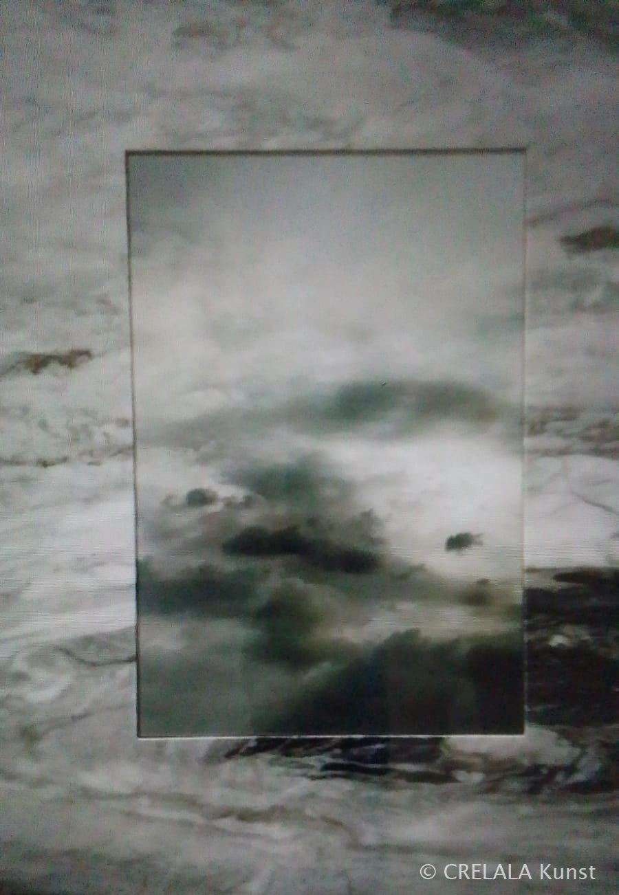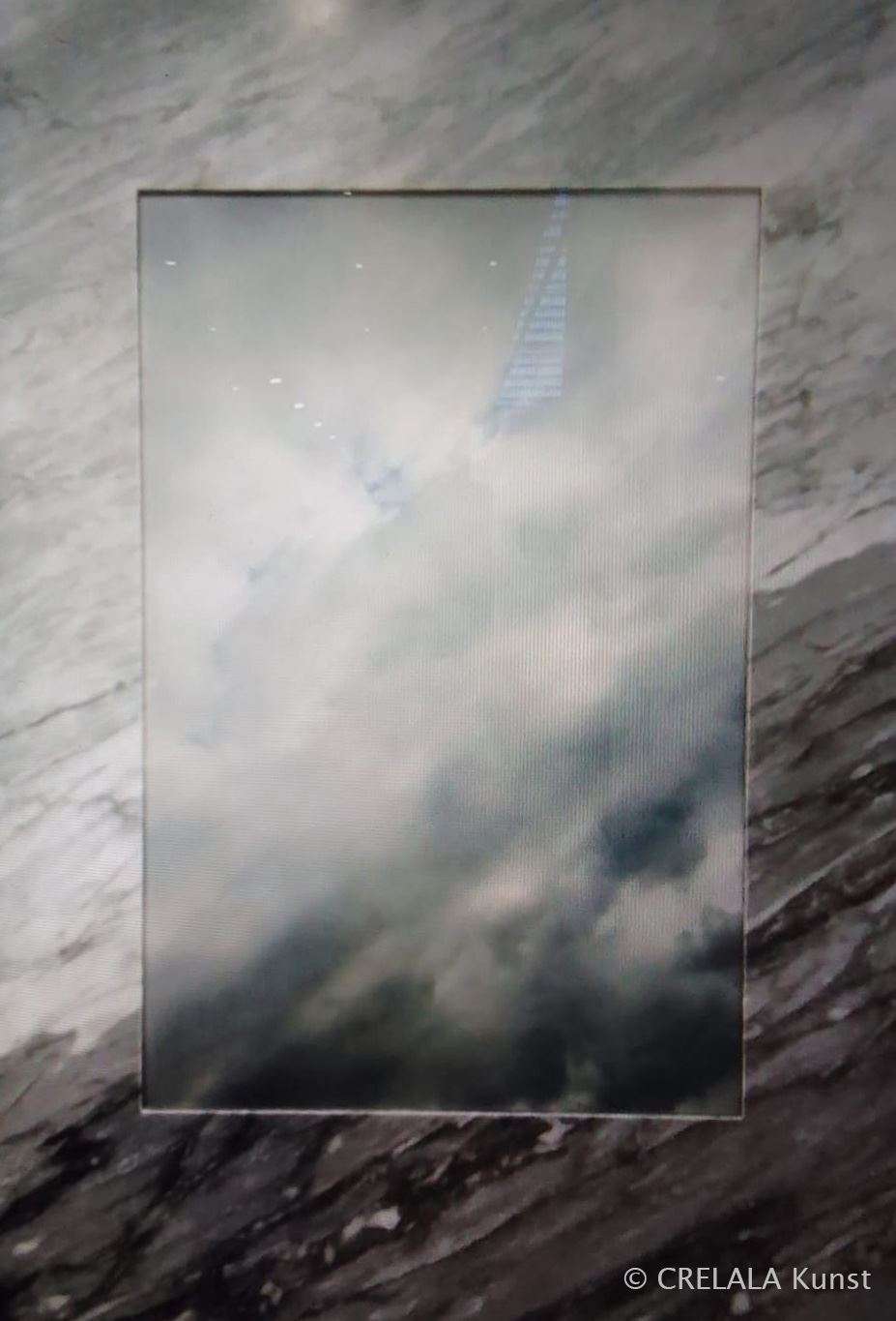 Galerie Martin Mertens zeigt mit TOMOYUKI UENO wie das Zusammenspiel von AI in der Kunst funktioniert. - Rahmen im Marmorlook, Himmel in gleicher Optik… Suche von Parallelbetrachtungen, Suche von Ansichten, die übereinander passen könnten, alles nur zufällige Fotografien und Ansichten im Netz, vielleicht gar nachbearbeitet über Bildbearbeitungsprogramme, assimiliert und angepasst, oder doch abgebildete Realitäten, die wirklich deckungsgleich übereinandergelegt werden können. Oder aber es sind die Ergebnisse der Kreativfilter der Bildbearbeitungsprogramme. Übermittelt in den kreativen Strömen und Wolken, die dann die Frage aufwerfen nach dem Zufall. - Alles nur artistisch- philosophisches Einerlei? Himmel und Erde verbunden, untrennbar eins, über den Horizont hinaus, in diesem Fall, in die Tiefe gedacht, ein Quader.
