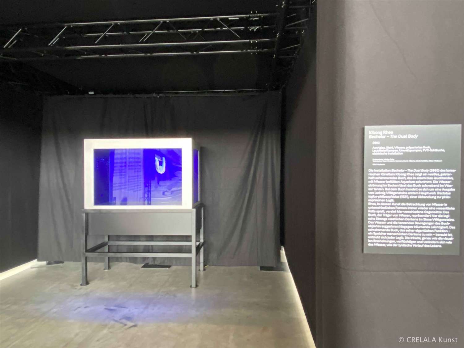 Bei Kibong Rhees „Bachelor“ fliegt ein Buch durch blauen Raum, ein tief blaues Wasserbecken… Tauchbecken, Experimentierfeld. Ludwig Wittgensteins „Tractatus logico philosophicus“ (1921) ist der Titel des Buches, so heißt es in der Beschreibung. Das Buch selbst, zusammengeklappt, im Abgleich, wie der Starwars Imperial Shuttle, oder der Dreizack im Ukraine Wappen. Ein Urzeitwesen in den Untiefen der Blauen Tiefe. Beabsichtigt, oder unbeabsichtigt, es ist das Phänomen der Kunst Entsprechungen finden zu wollen, und zu begreifen, wie der Künstler so „tickt“.