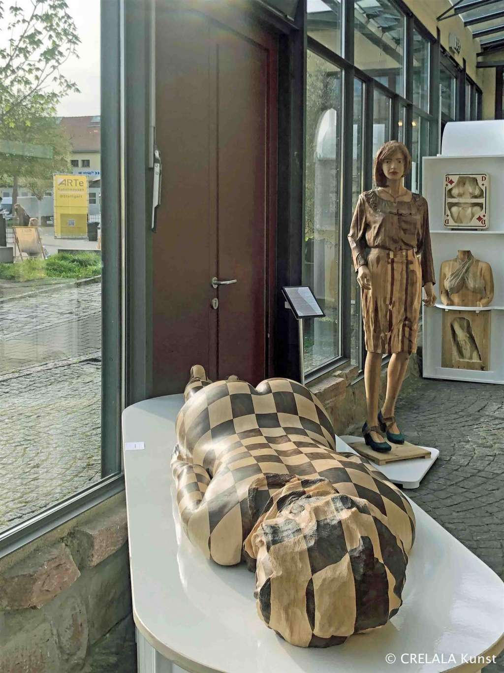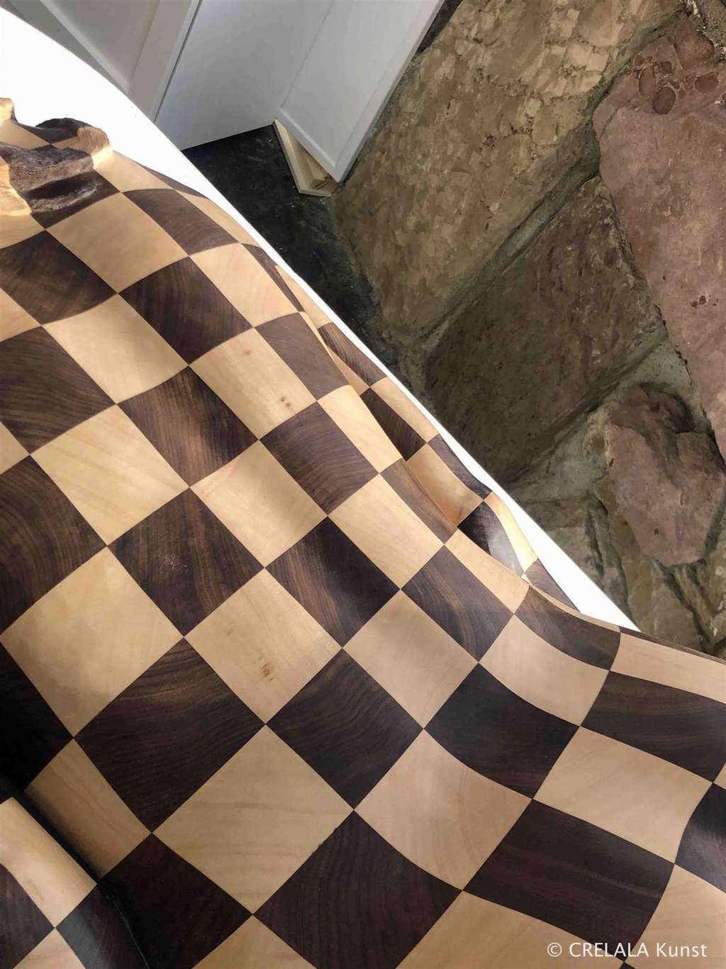 Helmut Westerkamps Schachbrettfrau liegt hinter Glas in der gleißenden Frühsommersonne. - Braucht Schutz. - Das Holz braucht Schutz. – Die Materie braucht Schutz. Schutz vor Austrocknung! – Schutz vor Umwandlung! - Schutz vor der Hitze. - Schutz vor der Strahlung.