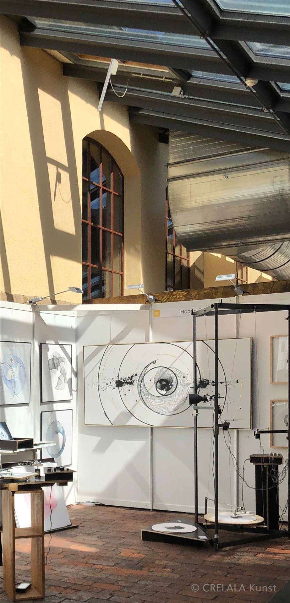 Direkt im Eingang präsentiert BALKE seine kinetischen Druckwerke. Feingetunte Maschinen arbeiten unermüdlich und erstellen Werke für den Künstler, die dann nur noch ein wenig modifiziert werden müssen. Denen noch die persönliche Note hinzugefügt werden muss.