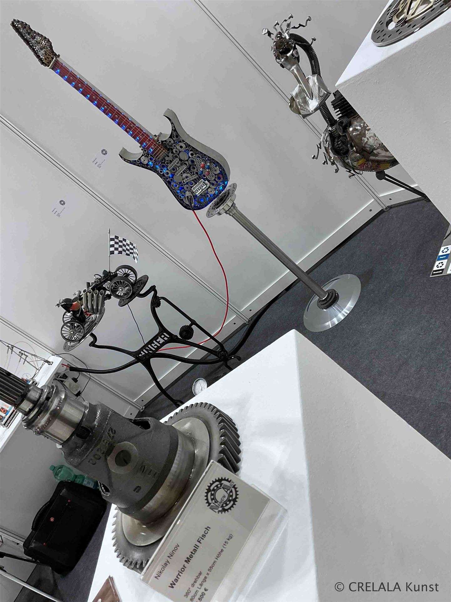 Unter Strom gesetzt bringt man eine Gitarre zum Leuchten. Passend zum Takt? Oder doch nur zufällig, nach vorgegebener Zeit. Eine farbwechselnde Gitarre, wie schwebend im Raum, geschweißt auf einen eisernen Stab.