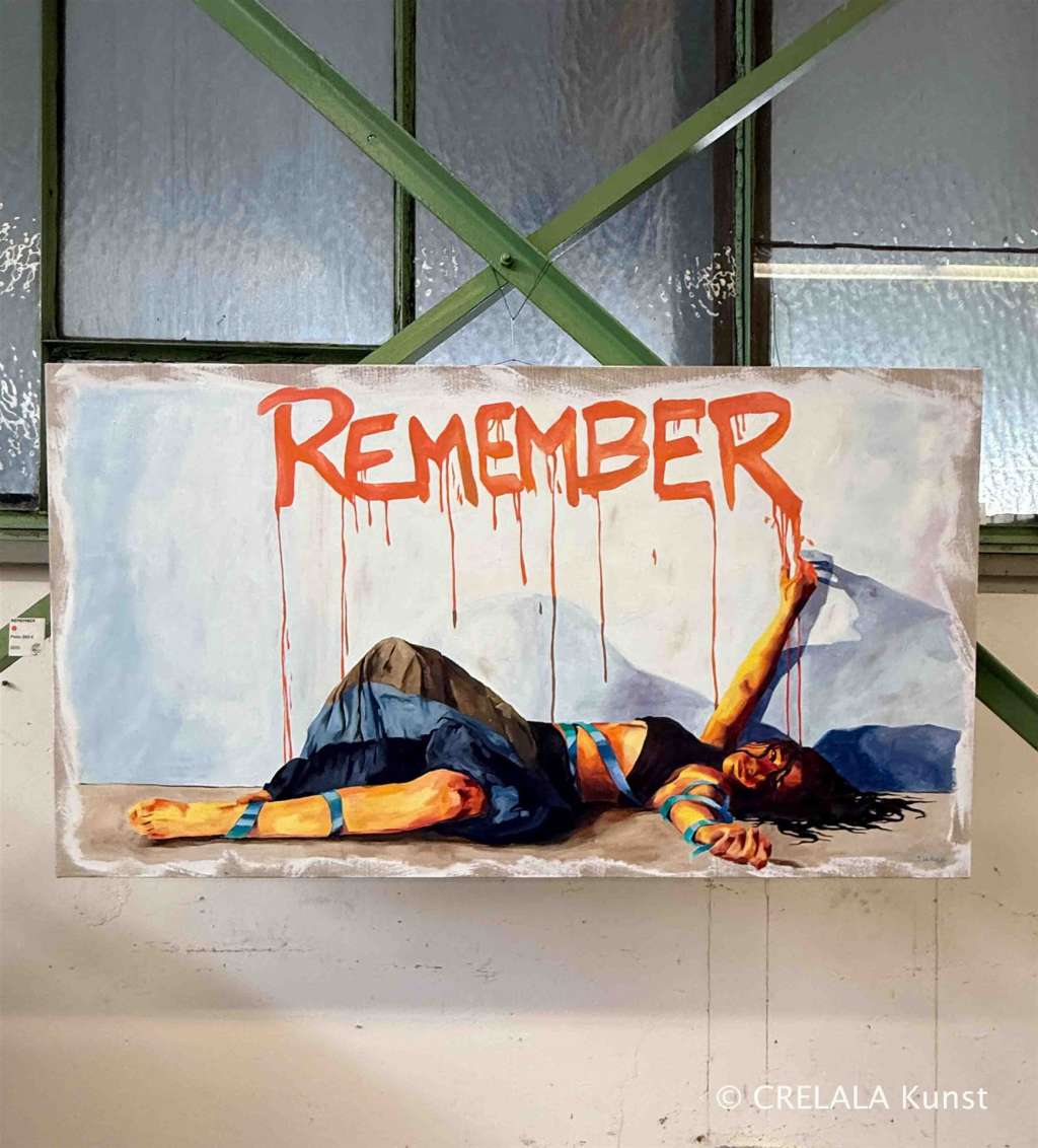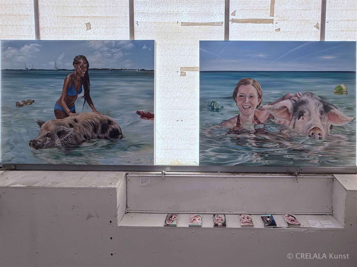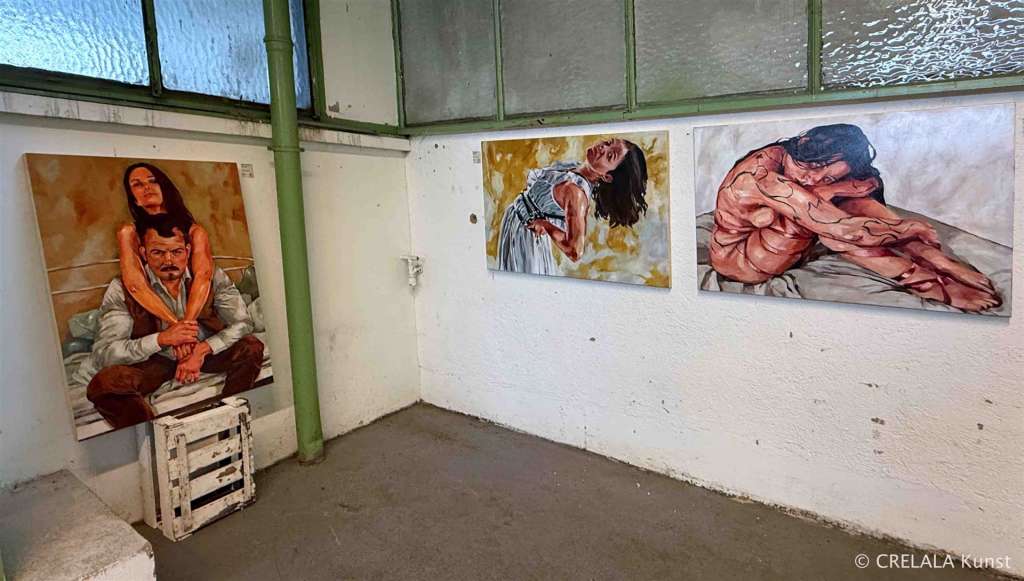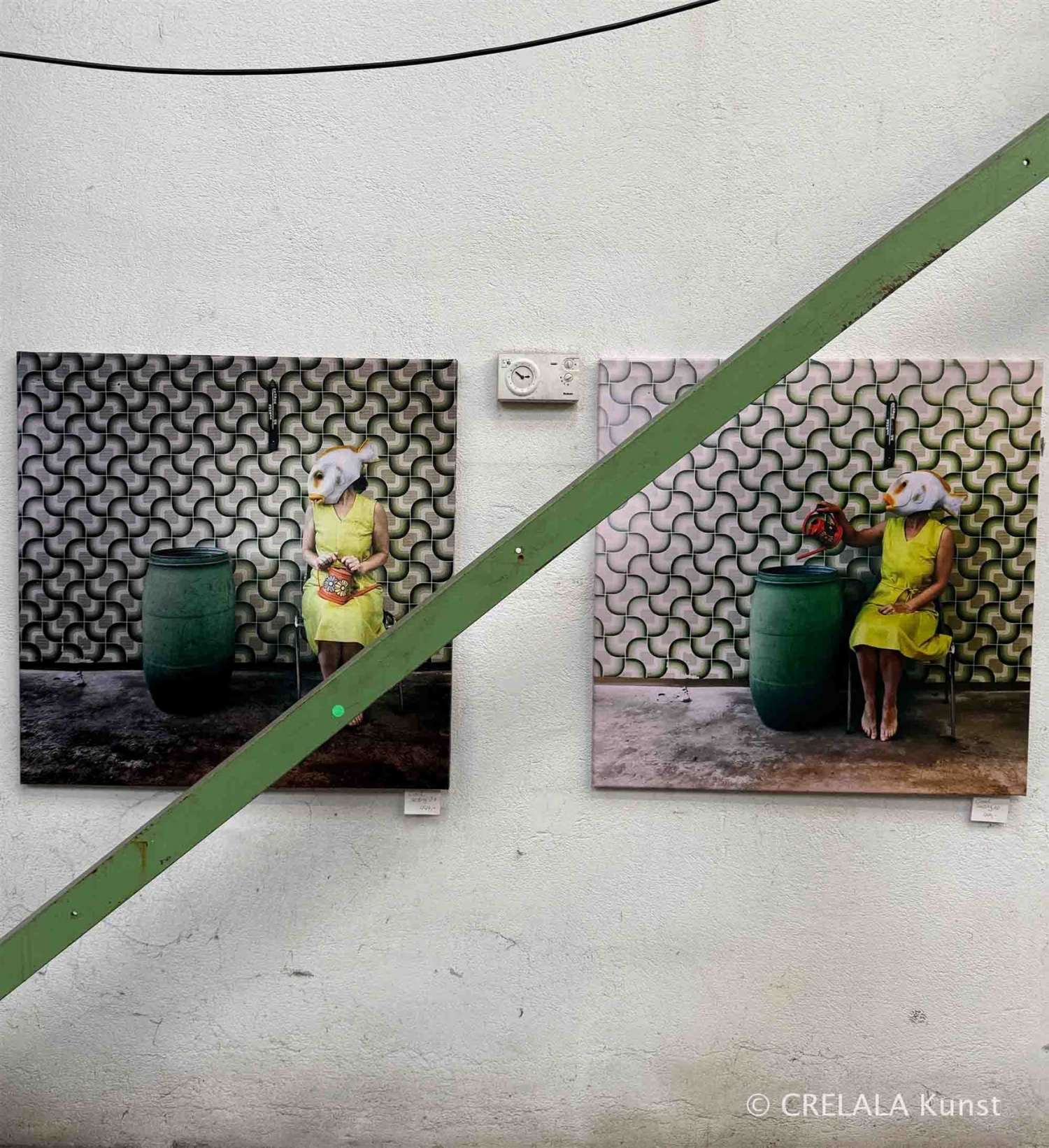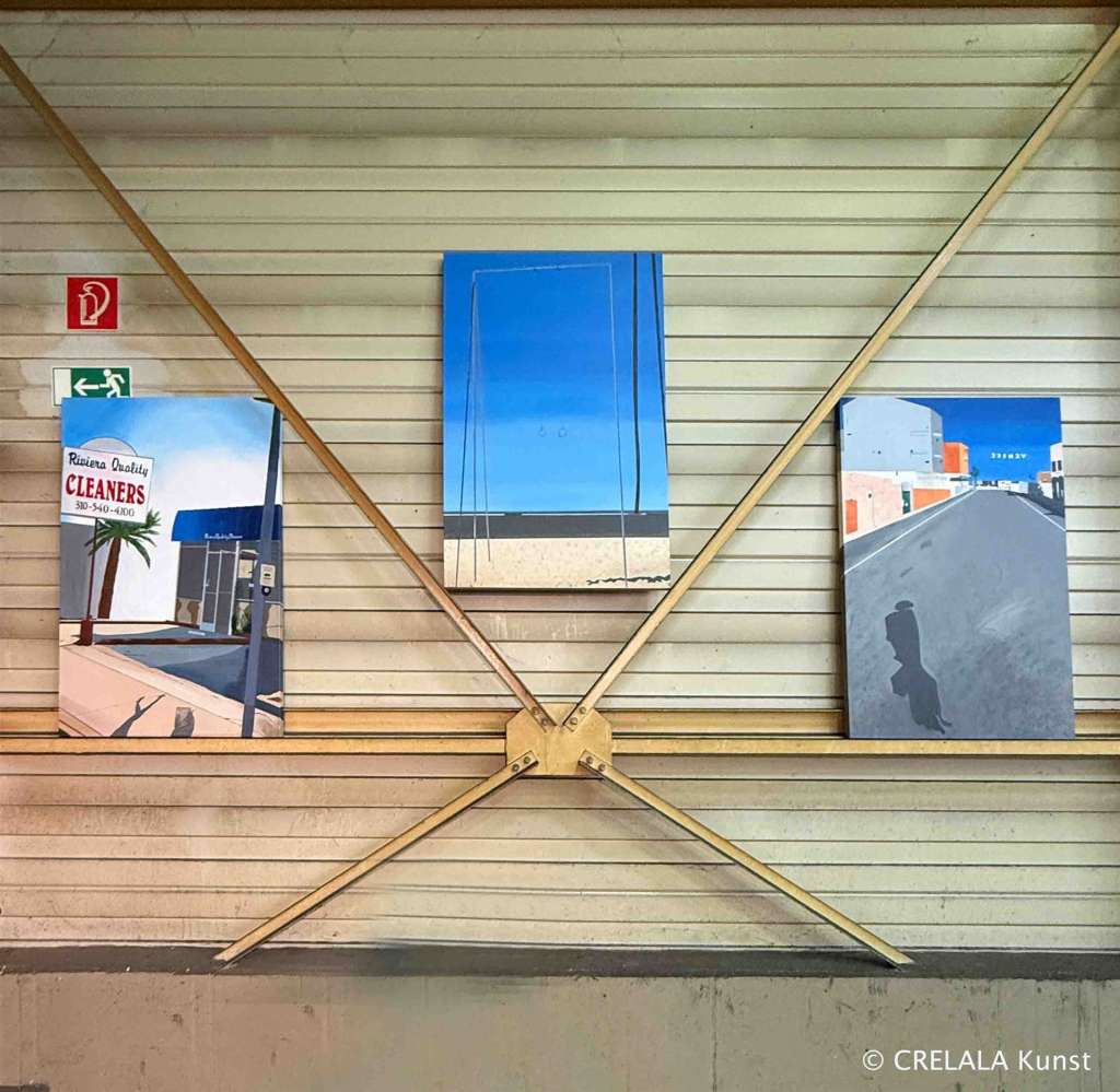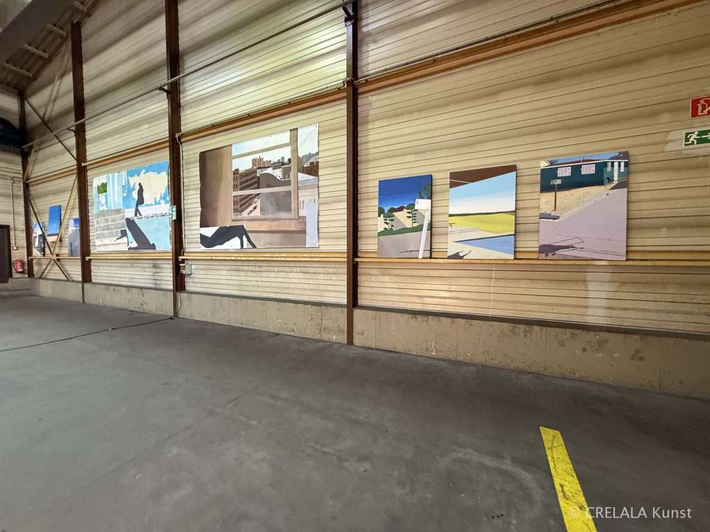 Das Hallenkonstrukt als künstlerischen Akzent und Grundgerüst nutzend kommt der Stahl samt Schutzlackierung und Bolzen als Detail zur Kunst zum Tragen. - Regina Heiser präsentiert ihre Kunst in besonderer Hängung entlang der vorgegebenen Baukonstruktionen. - Schatten, Fenster, Popart, großflächiger Farbauftrag… Cleaners… die Künstlerin malt plakativ, und verführt zum zweiten Blick, der mehr erkennen lässt, als man auf den ersten Blick glaubt. Es lohnt sich IMMER zweimal hinzuschauen. - In der Kunst vor allem. - Vielleicht erkennt man auf den zweiten Blick das Wesentliche, das beim schönen Schein des Ersteindrucks verborgen bleibt. !