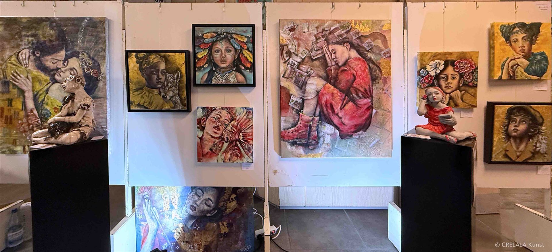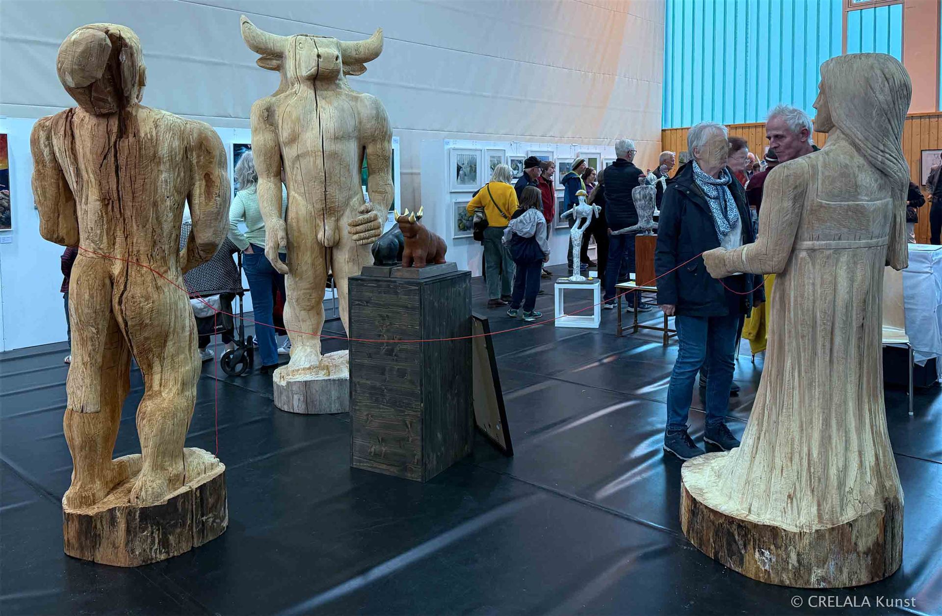 Präsent stehen auch drei Großskulpturen von Werner Schüßler, wie gerade der griechischen Mythologie entsprungen, in der Mitte des Labyrinths, und Minotaurus erinnert daran, dass es die Gesellschaft der Gegenwart, mit all dem Wohlstand, behütet durch das Volk selbst, das seine Herren selbst wählen darf, so nicht geben könnte, wenn die Geschichte vor über zweitausend Jahren anders verlaufen wäre. Und je nach Blickwinkel schimmert die ägyptische Mythologie noch durch. Die vielen Götter, denen man huldigte, die sich vereinten zu einem, der seither den Ton angibt, hatten den Vorteil, ein Jeder hatte nur so viel zu schultern, wie er auch tragen konnte. Wenn alles auf eines Schultern abgeladen wird, wird es schwierig. Und wie ein Mahnmal weckt die Kunst dann auch die, die eigentlich gar nichts mit all dem zu tun haben wollten.
