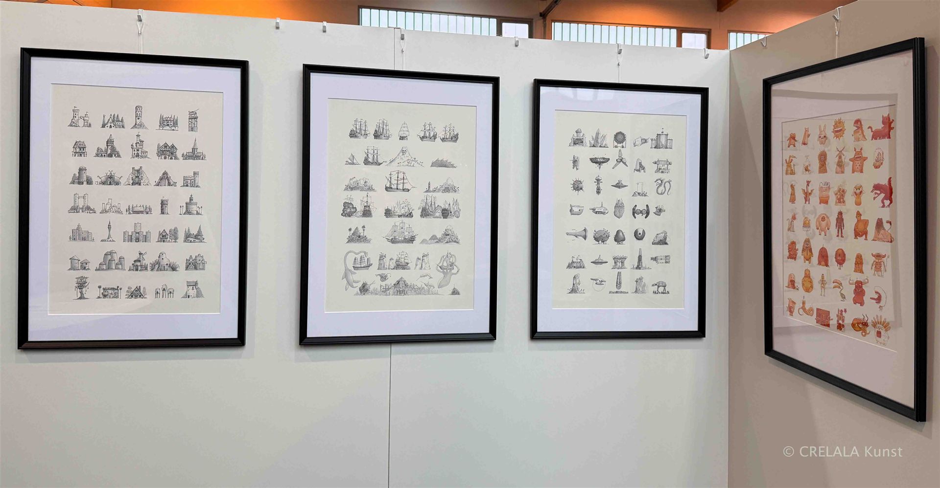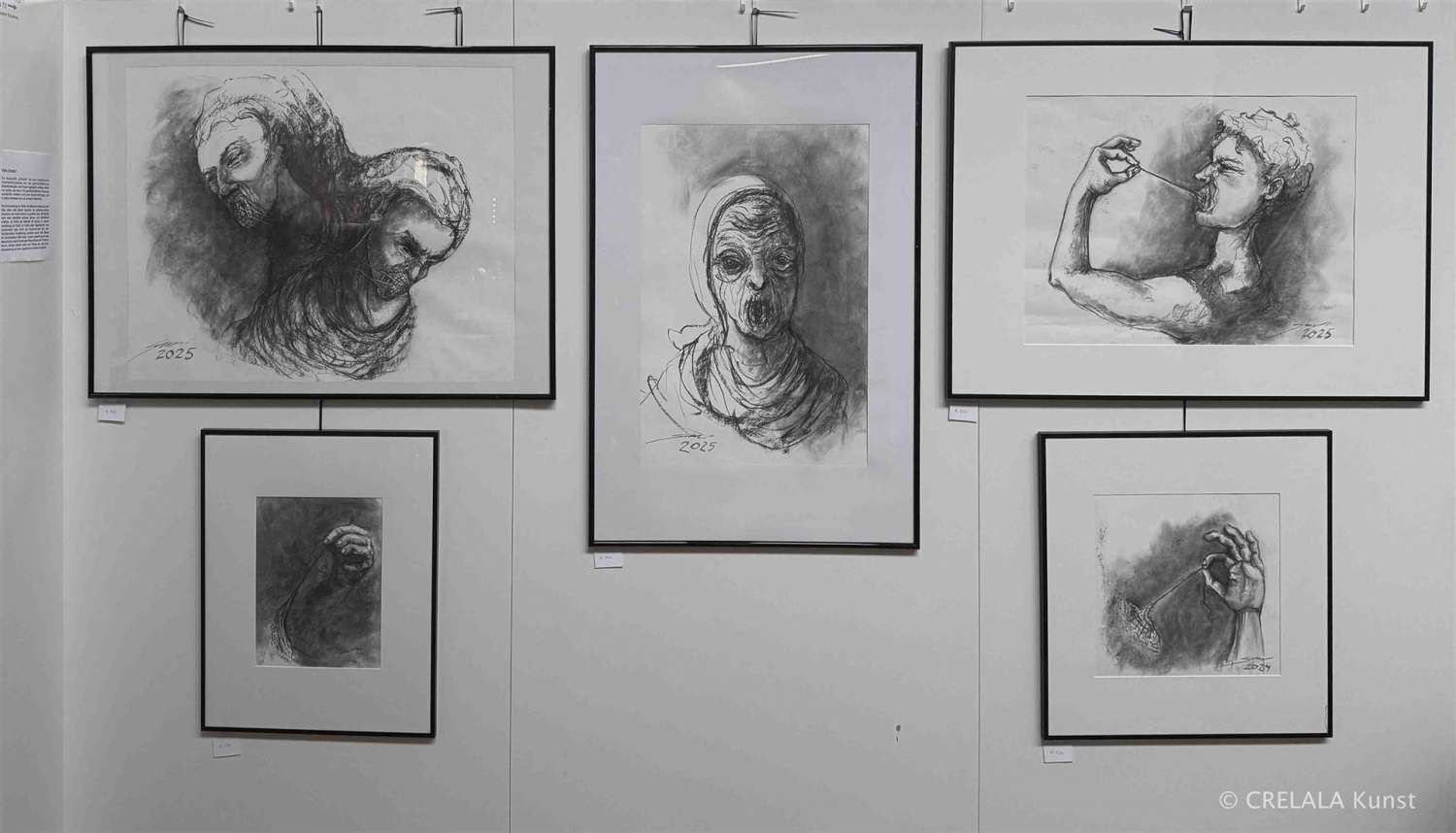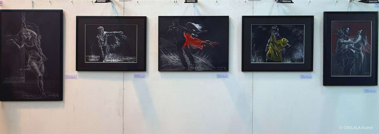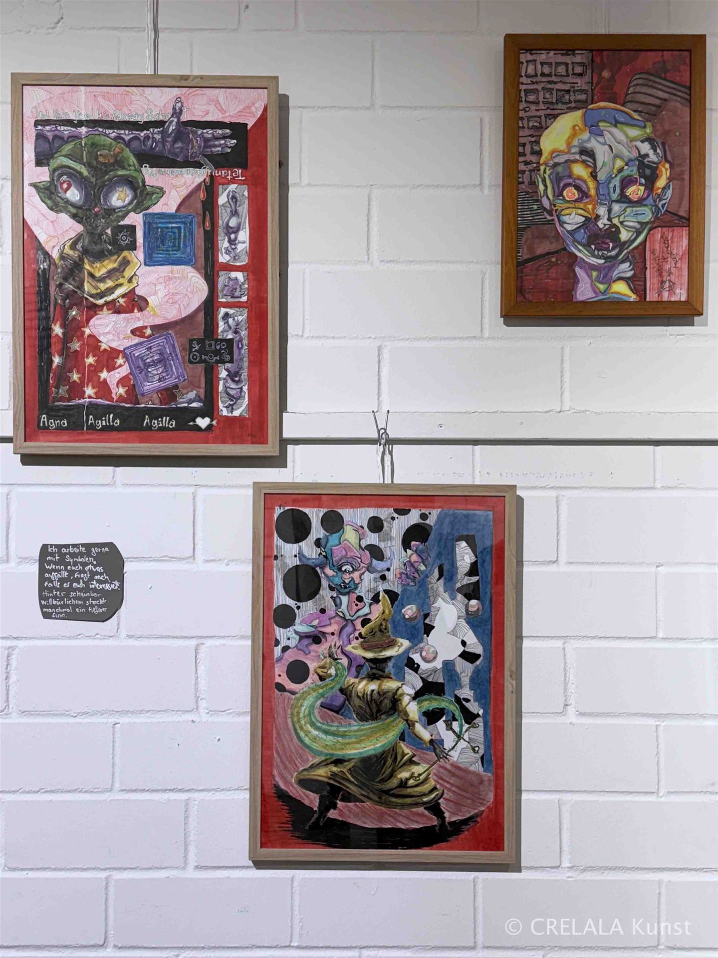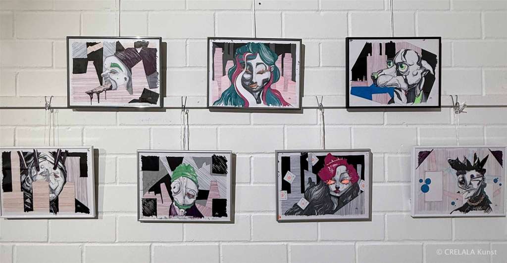Gebraucht, wie all die Helfer und Engel in (sozialen) Brennpunkten, die erkennen, wann Zeit ist einzuschreiten und zu handeln, wenn die Betroffenen keine rechtlich sicheren Möglichkeiten haben. – Helfer und Hingucker – Informanten und Berichterstatter. Menschen wie Dirk Mecking, der in sieben Bildern überlässt, was sich in den sozialen Brennpunkten abspielt. Er rückt eine Parallelwelt in den Fokus, die man vielleicht nicht unbedingt kennenlernen will. Die sozialen Schichten im Fokus, sind Verzerrungen Dirk Meckings Stilmittel. Hinter den Fassaden seiner Hochhäuser in Strichzeichnungen geht es unter anderem um Drogen, und seine Figuren sollen zeigen, wie es sich anfühlt, der Konsum. - Wie sich zum Beispiel eine Zunge anfühlt, vielleicht vor, während und nach dem Rausch. - Die Unterschichtenproblematik kommt klein und homogen daher, wird aber begleitet von den größeren Formaten der Zauberer, links daneben.