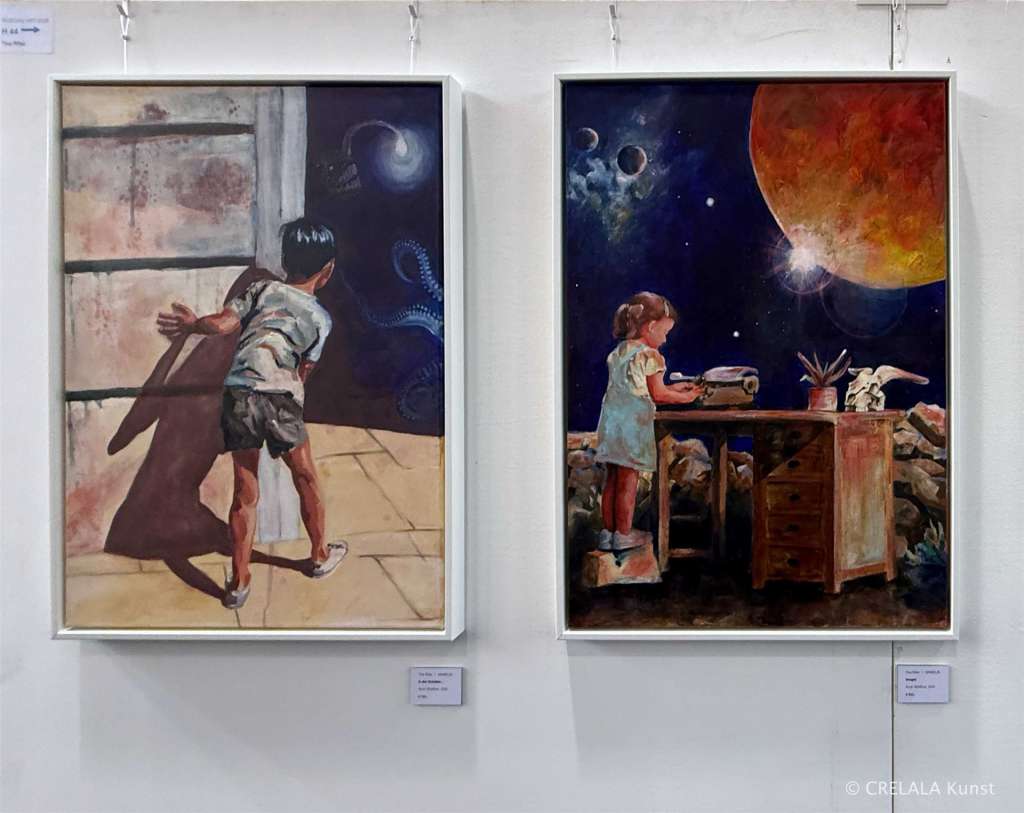 Erkennen, wie die zufälligen Ähnlichkeiten von Ansichten, die sich in den Bildern offenbaren, die Mimbelbi den Kunstliebhabern präsentiert. Der Junge, der ins Dunkel schaut und entdeckt, was nicht für seine Augen bestimmt war, ein Mädchen, ein Kind noch, das an den Regeln kratzt, die einst aufgestellt wurden, um zu erzählen, selbstkritisch und fokussiert, und das gehört wird in den unendlichen Weiten des Universums, das nicht taub ist für das, was die Kleinen zu erzählen haben, die so oft niedergeschlagen und traurig sind, weil ohne Chance und ohne Hoffnung. Nur als Beigabe von Leben, die auf Höheres aus sind, ohne zu erkennen, dass das, wonach sie streben, vielleicht auf den Irrweg führt.