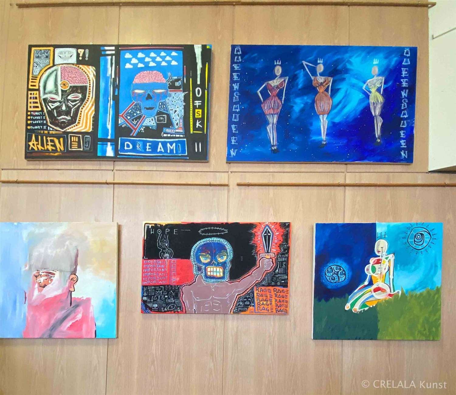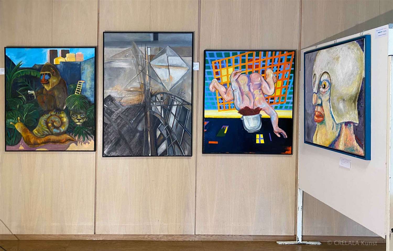 Herbert Fröhlichs fröhliche Malerei, mit einem augenzwinkernden Blick auf eine bizarre, so oft unverständliche Welt, die man so oder so, oder auch ganz anders sehen kann, bringt immer wieder zum Schmunzeln. Spiegelwelten zum Einen, ein Gitternetz-gewerktes zum Anderen, mit einem Nackten mit dem Kopf im Topf, über einem Fenster … man muss schon abstrakt denken können, um Herbert Fröhlichs eigenwillig surreale Welt verstehen zu können. Aber wer bei allem Wahnsinn im Leben den Humor nicht verliert, für den heißt es bei Fröhlich gewiss: Der Name ist Programm!
