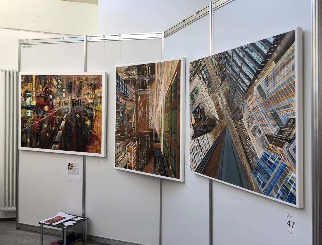 Toni Keller, der den Jurypreis der Ausstellung, punktgleich gemeinsam mit Nadia Kimova gewann, beeindruckte mit seinen Großstadtansichten. Keller liebt die Perspektive und während die früheren Werke in den Raum wirkten zeigte er dieses Mal eine Ansicht, die in die Tiefe wirkt. Tatsächlich wirken die Bilder, wie aus der Ansicht einer Drohne. Vogelperspektive in vollendeter Form.