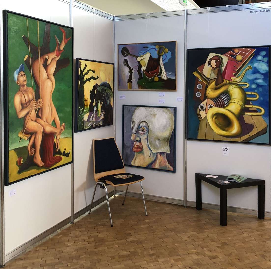 Wie kreativ Menschen ihre Sicht auf die Welt darzustellen imstande sind, zeigen auch die Werke von Herbert Fröhlich, der seine Sicht der Dinge teilweise skurril und bizarr abbildet. Fröhlichs "Krieger", wahrlich keine Schönheit, ist dennoch anziehend auf seine Weise. Obgleich nicht vertraut, ist es als träfe man einen alten Bekannten wieder und man beginnt zu grübeln woher dieses Gefühl kommt Und beim "Paradies" wird es sicher nicht ganz unbeabsichtigt sein, dass es der nackte Herr ist, der das asiatische Aussehen erhalten hat. - Verdrehte Wirklichkeit. Wer also ist der Sünder? Da darf man mal verharren und drüber nachdenken. Die Welt in Ansätzen surrealistisch zu verzerren, wenn auch nicht ganz im Stil der großen Meister, das ist Herbert Fröhlich! - Seine Gemälde verlangen unbedingt einen zweiten Blick.
