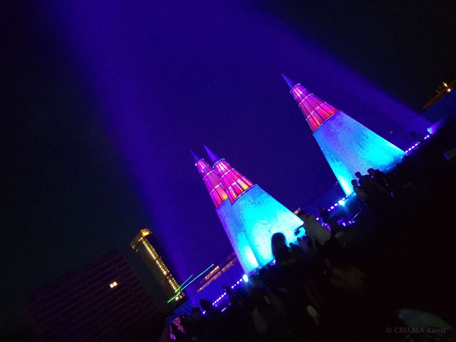 Zuerst ist es ein glühender Abendhimmel, wie ein überirdisches Geschenk für 30 Jahre hervorragende Arbeit, dann erstrahlen so allmählich die CREATIVE CONES des Lichtkünstlers KARI KOLA im blauen Licht.