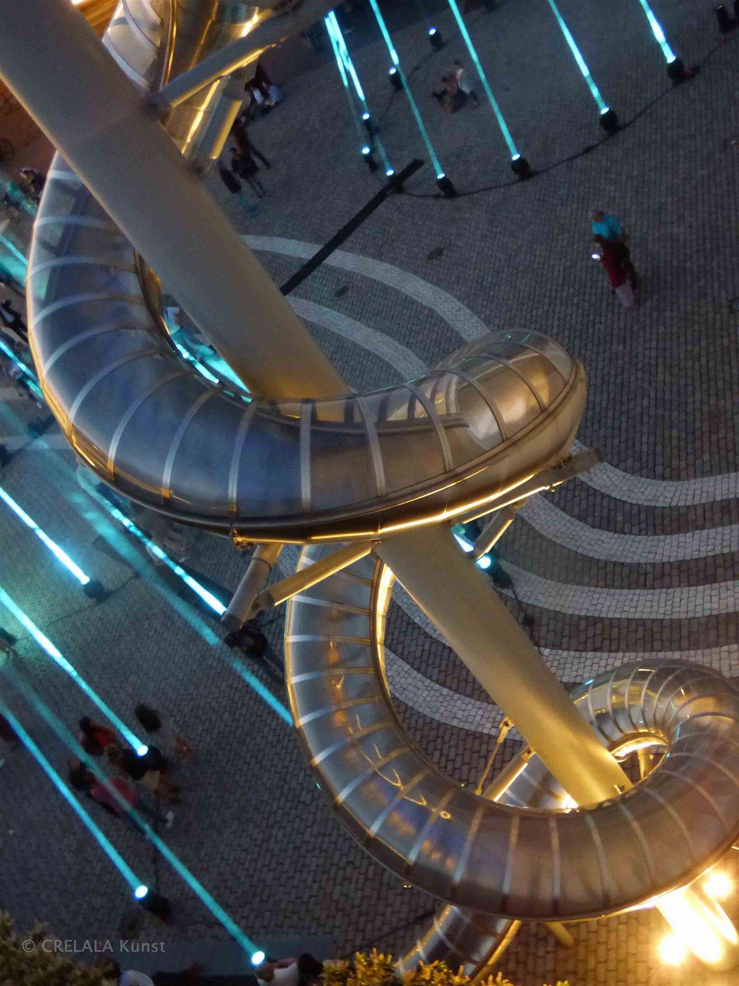 Die Riesenrutsche, spiralig aufgewunden, wie eine Schlange, erinnernd an den Äsculap-Stab, oder ein einzelner DNA-Strang, oder eine sich windende Tänzerin um eine Stange, glänzt reflektierend im Licht.