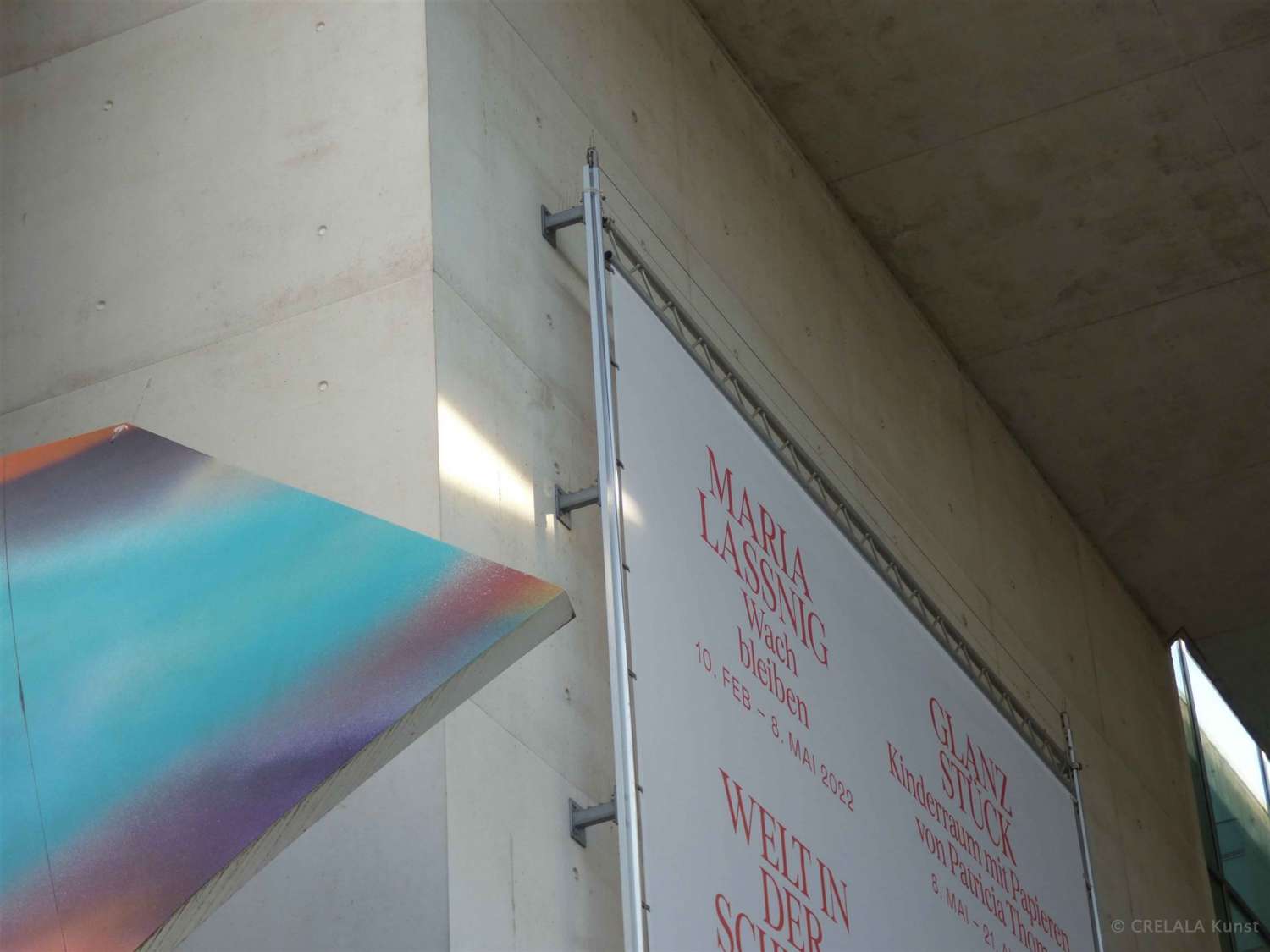 Vielleicht erinnert die Curve entfernt an die überdimensionale Skulptur eines, ja was eigentlich (?), bunt besprühten Rotorblattes (?) im Durchgang zum gegenüberliegenden Gebäude des Museumskomplexes. Rotorblatt? Surfbrett? Skateboard? Auf jeden Fall GROSS! Und als hätte man sie vergessen, hängt noch die Ausstellungsankündigung von Maria Lassnigs „Wach bleiben“, der Ausstellung, die am 8. Mai endete, neben Glanzstück - „Kinderraum mit Papieren“ von Patricia Thoma (8.5-21.8.)