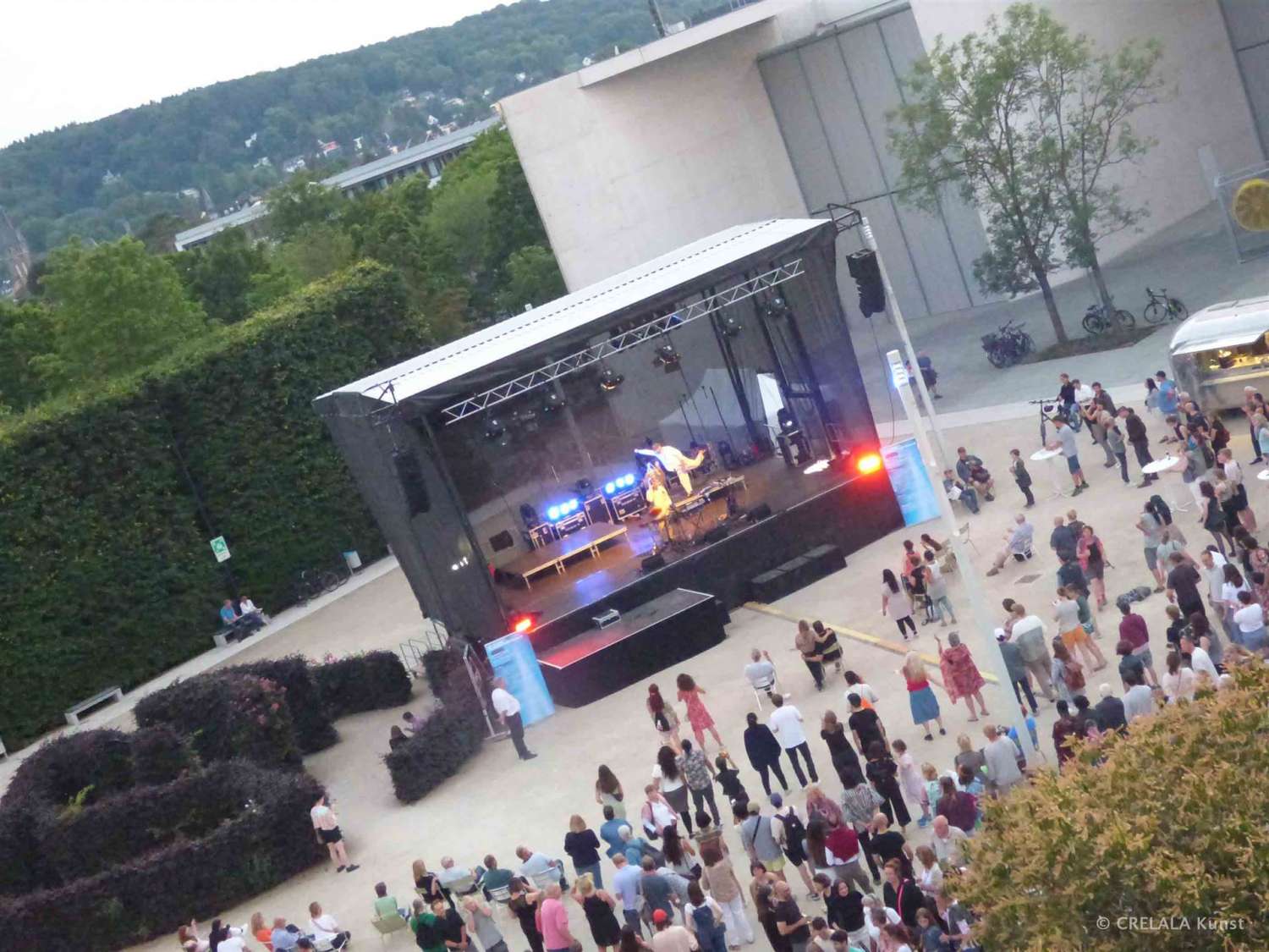 Der Museumsplatz mit seinem natürlichen, baumbepflanzten Sonnenschutz bietet ein Biergartenambiente, das nicht nur Museumsbesucher erfreuen dürfte und der Dachgarten mit den drei Licht-Einfalls-Kegeln, sowie der Riesenrutsche nach unten, lädt unbedingt ein, sich ab und zu mal Auszeiten zu gönnen. Man sollte nicht alles so bierernst nehmen, wie von KESHAVARA gegen Abend eindrucksvoll demonstriert wird.