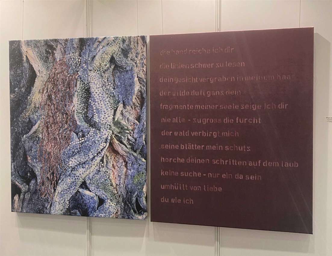 Auch Eva Michielin hat sich der Natur verpflichtet. Samt und Federn, Schrift und Struktur. Die großformatigen Werke erinnern an Erdstrukturen und Luftbilder. Landschaftsaufnahmen von oben. Erdtöne und Krustenstrukturen, Experimente, die teilweise am Computer entstanden sind ziehen magisch an. Seit zwei Jahren hat die Künstlerin sich ganz der Kunst verschrieben. Es geht um Licht, um Leben, um Weiblichkeit und „Empowerment“, und nicht zuletzt um Liebe und Kommunikation. Man spürt die Schönheit von Existenz, die das Leben reicher macht. Sie hat einen ganz besonderen Blick, dem man gerne folgen mag und vor allem die ausgestellten Arbeiten als Diptychon, mit einer Seite aus monochromatisch abgestimmtem Samtwerk beeindrucken, auf dem mit Schablonen aufgerauhte Worte hinterlassen werden. Worte, wie Zitate, oder Lyrik, Worte, wie Liebeserklärungen, und manchmal mit besonderen Lettern, die gespiegelt werden und die man, wie auch bei Karina Laru-Nau, von rechts nach links lesen muss, um über den eigenen Horizont hinaus zu verstehen.