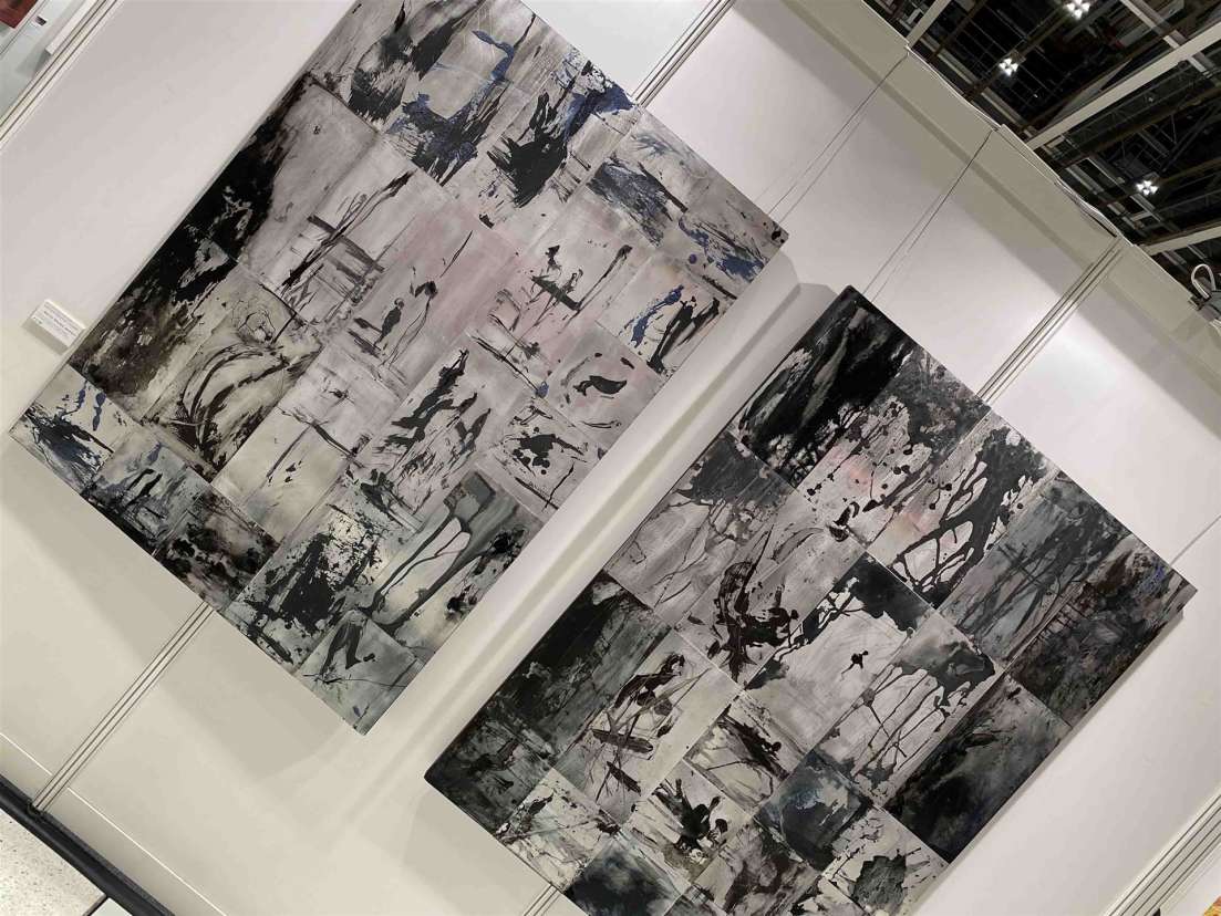 ArsCubis mit Achim Großmann ist ein Highlight der Messe, und ein Großformat der Welt mit einem Kreise ziehenden Epizentrum asiatischer Werte, so interpretiert man das Werk in den Farben Gelb und Lila, lädt zum Grübeln ein.
