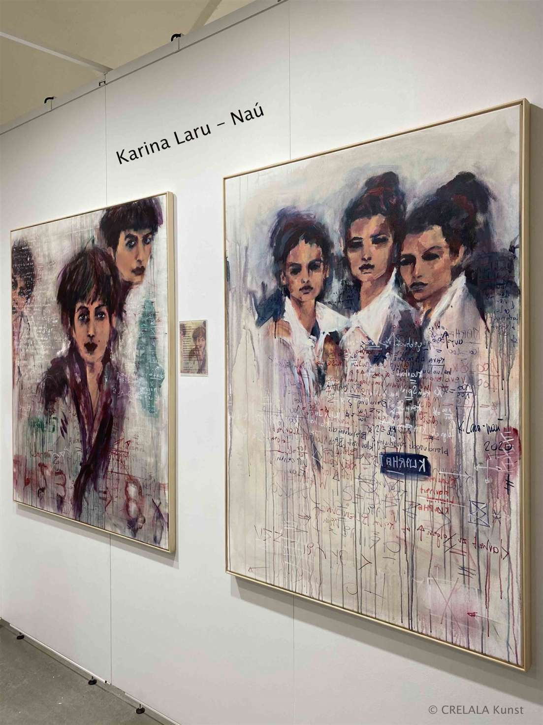 Karina Laru - Naú zeigt ein Kabinett ganz anderer Art. Wieder sind es Frauen, die faszinieren. - Jung, jugendlich, mit dunklen Augen. Karina Laru - Naú beschreibt vom Werden der Werke, in denen Geschriebenes einfließt, wie von fremder Hand geführt, alles spiegelverkehrt geschrieben. - Sie war Linkshänderin, das hat man ihr abtrainiert. - Es gibt sie, jene Kinder, die beim Beginnen des Schreibens spiegelverkehrt schreiben, die anders sehen und vielleicht die Welt aus anderen Augen wahrnehmen. Kinder, denen man das „gute Schreiben“ erst beibringen muss. Wie vielen Kindern wurde in der Vergangenheit ein Talent aberzogen, weil man das „gute Händchen“ trainieren wollte? Alles muss angepasst werden. Konformität erlangen. Irgendwann vergisst man es, wundert sich nur vielleicht manchmal, warum man Dinge anders sieht als andere, bis dann die nächste Generation heranwächst und die Gene sich Bahn brechen. Wenn die nächste Generation ebenfalls spiegelverkehrt sieht, die Hand spontan links reagiert, erinnert man sich wieder. Karina Laru - Naús Zauber liegt genau darin: Dem Zulassen der alten Kraft, mit der man geboren wurde. Die Zeichen zuzulassen, die spontan kommen, spiegelverkehrt, als wolle einen das Gegenüber führen. Eine unsichtbare Macht, die auf der Ebene der Leinwand liegt, die im besten Fall aus Naturfasern besteht, Fasern, die einmal etwas Lebendes gewesen sind. Ein stummer Dialog zwischen Leinwand und Künstler, die GEMEINSAM etwas aus der Taufe heben, in das der Betrachter dann eintauchen kann. Wer sich fallen lässt, kann sie spüren, die Magie in der Kunst der Karina Laru - Naú.