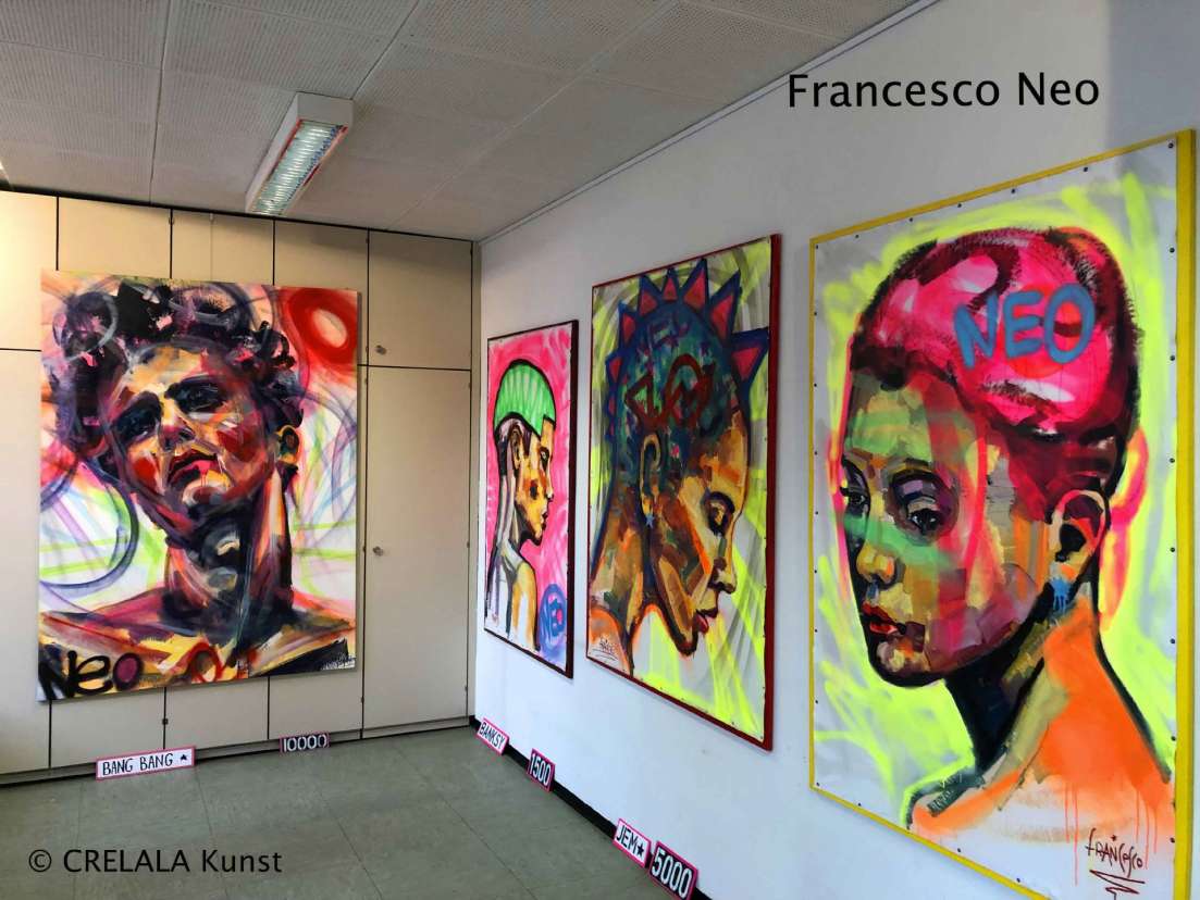 Ebenfalls farbgewaltig erkennen wir NEO wieder! Doch anders als Kerstin Emrich Thomas setzt er seine Menschen nachdenklich in Szene. Ernsthaftigkeit wird in den expressiven Gesichtern transportiert. Ein anderer Aspekt von Menschlichkeit, nicht weniger wichtig als Frohsinn.