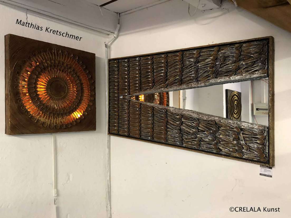 Man könnte ihn als Löffelkünstler abstempeln, auf jeden Fall wüsste jeder Kunstliebhaber von wem man spricht, wenn man auf die Kunstfertigkeit hinweist Löffel in Szene zu setzen, doch Matthias kann weit mehr als nur Löffel inszenieren. Er hat ein Gespür für die Harmonie des visuell Wahrnehmbaren. Mittlerweile zu einer festen Institution der ART MUC geworden, schafft er es jedes Mal aufs Neue einen mit seinen Werken in den Bann zu ziehen. So wie andere ab und zu zu tief ins Glas schau n, so schaut er bisweilen zu lange in die Besteckkästen und lässt sich inspirieren. Lichtimpressionen aus LED und das Arbeiten mit Spiegeln haben eine einzigartige, nicht selten beruhigende Wirkung. In diesem Jahr watete er unter anderem mit dem exklusiven Berndorfbesteck auf, welches er auf Spiegeln und mit gekonnter LED Beleuchtung in Szene setzte. Und erstmals durchbricht er in seiner neuen Serie die bisher klassischen runden und quadratischen Strukturen.