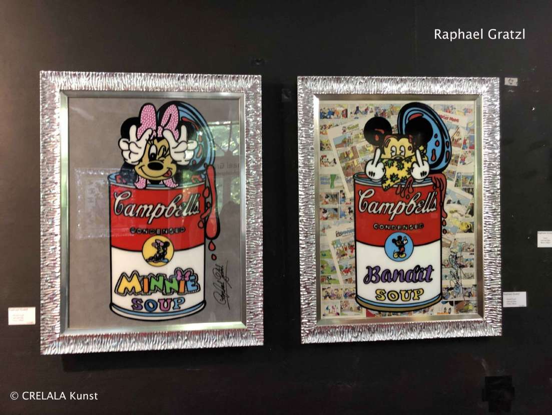 Wer würde heute noch das Logo von Campbell erkennen, gäbe es da nicht Andy Warhols Campbell s Suppendosen? Und Raphael Gratzl setzt noch eins drauf: Minny und Micky Mouse als Dosenspaß in der Campbell Dose, na wenn das nicht mal eine geniale Idee ist. Er arbeitet in seinen Werken gern mit Lacken und intensiven Farben und da beidseitig auf Glas aufgetragen erhalten sie damit eine ganz besondere Tiefe. Überdies liebt er Glitzer und nicht zuletzt diese Note beschert ihm einen besonderen Wiedererkennungswert.