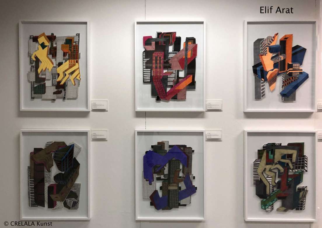Cutter, Marker, Buntstift sind die Werkzeuge von Elif Allat. Es entstehen unkonventionelle, experimentierfreudige Kollagen auf Papier, die wirken wie Großstadtansichten der etwas anderen Art. Klare Strukturen mit Elementen architektonischer Grundzüge,in die bei genauerer Betrachtung häufig Auszüge von Gesichtern, vornehmlich Mund und Nase, eingearbeitet sind. Die 3-dimensionale Wirkung macht die Kollagen einzigartig.