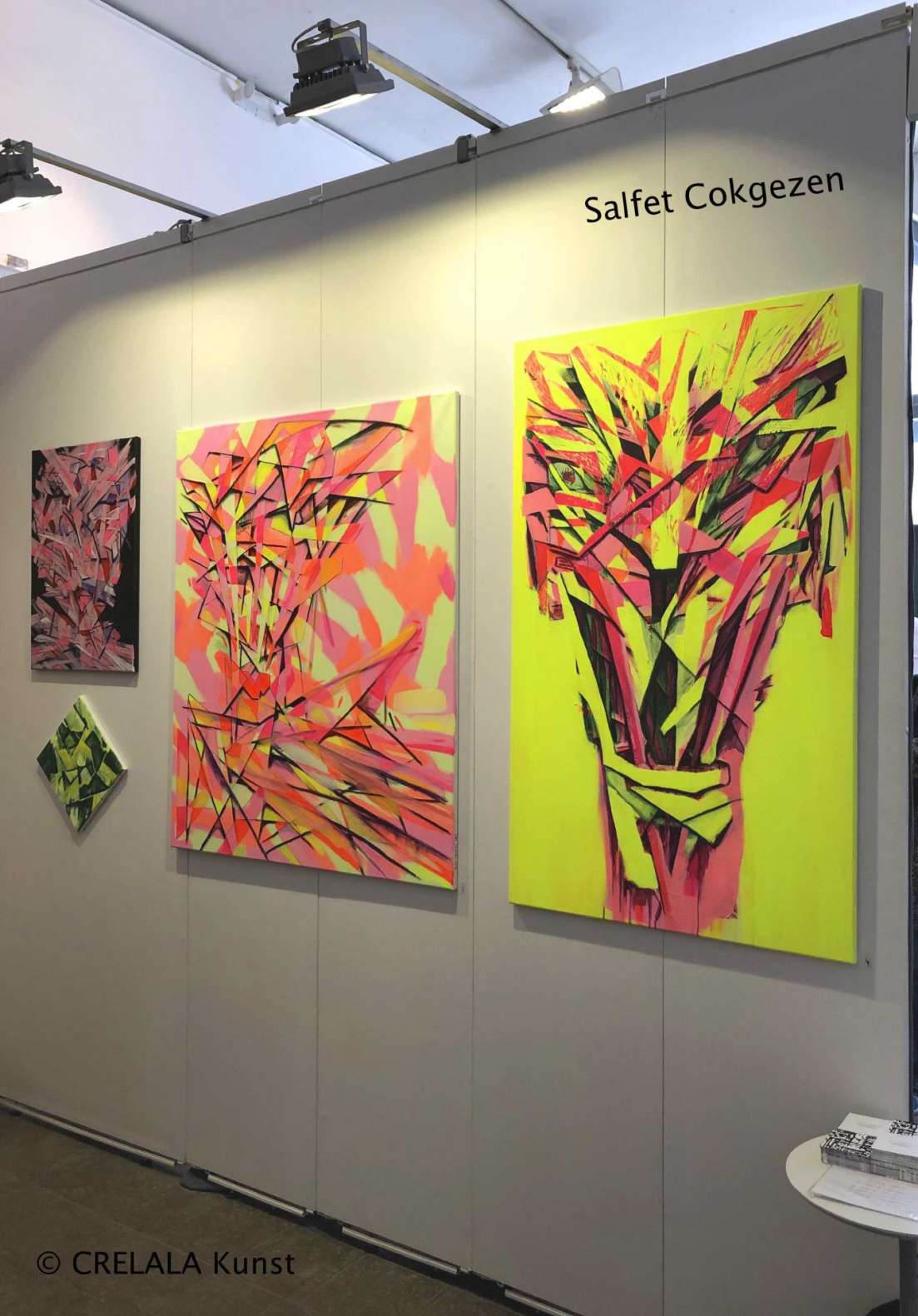Eine weitere heranwachsende Größer der Street Art Szene ist der Sprayer Saffet Cokgezen, der sich mittlerweile verstärkt der Malerei gewidmet hat. Mit kubistischen Zügen und intensiver Neon-Farb-Gestaltung drücken seine Werke puren Optimismus aus. Die Werke selbst lassen viel Spielraum zur Interpretation. Aber selbst wenn man kein eindeutiges Motiv erkennt sind die Werke sehr fröhlich und damit lebensbejahend. Solange der Neon-Trend anhält werden sie sicher immer wieder auf Sammler und kaufinteressierte Neugierige stoßen.