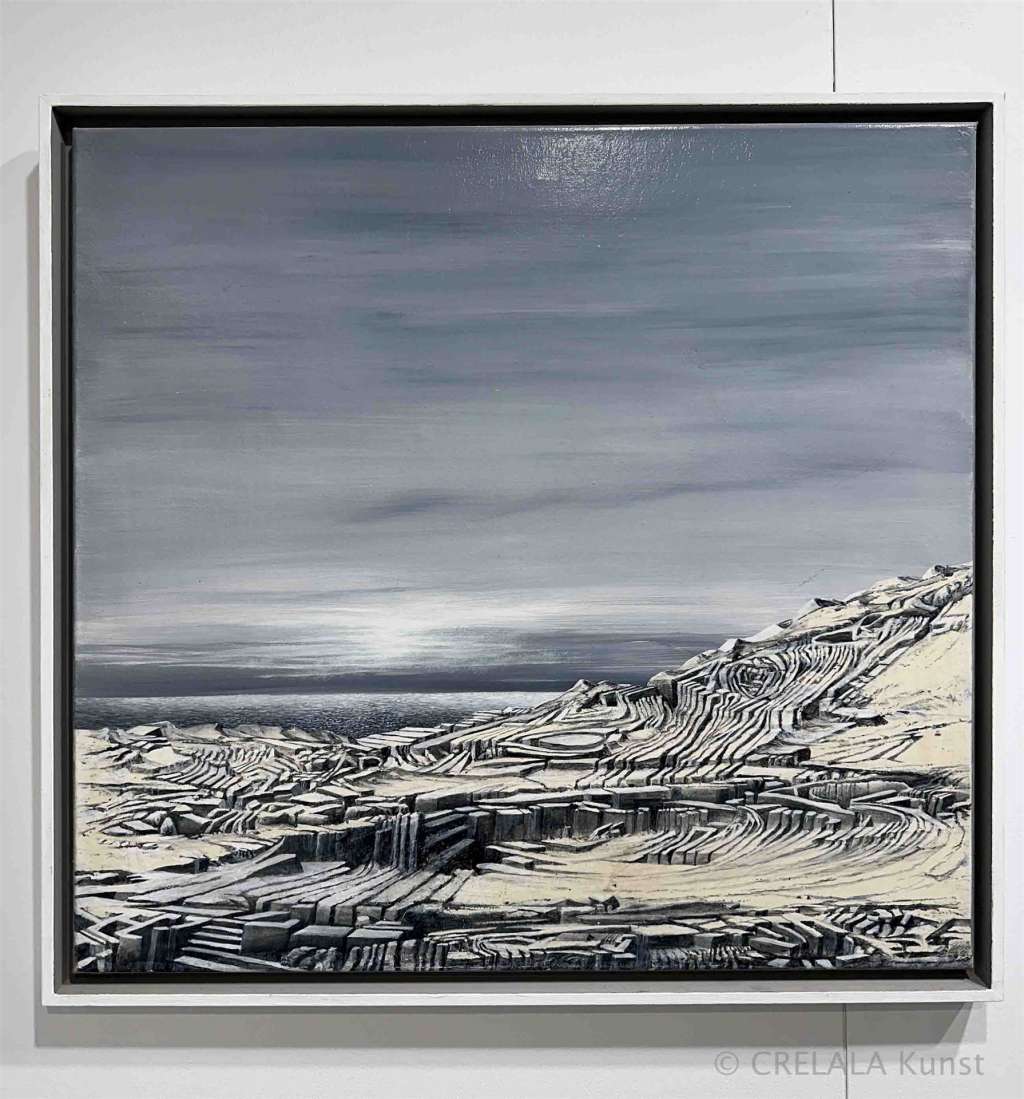 Bei J.G. Schimmelpenninck muss man unwillkürlich an Szenen aus dem Gaming denken. Kreierte Welten voller Spalten, geometrisch angeordnet wie Ebenen, aus denen am Ende neue Welten entstehen. Welten, in die man im Gaming abtauchen kann. Öde, karge Landschaften, wie am Ende, oder auch am Anbeginn der Zeit. Intelligentes Design erfordernd unter graunebligem Himmel. An den Küsten paralleler Welten. In der Ferne verliert sich der Horizont! Vielleicht im Mondschein, mit gleißendem Licht. Die Felsen an der Küste gebrochen. Nicht wie Basaltsäulen, eher radial gespalten. - Gespalten, wie man es von Gletschern kennt. Mit Spalten wie Tiefen, in denen sich alles verlieren kann. Verschwinden. Komprimiert wird es eingebettet in die Masse, nicht mehr sichtbar, aber noch immer existent, bereit zur Metamorphose, bei sich stetig verändernden Rahmenbedingungen. Vielleicht Druck, vielleicht Temperatur, thermogemixt, dann ändert sich die fluide Phase und die Masse wandelt sich.