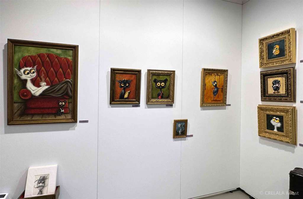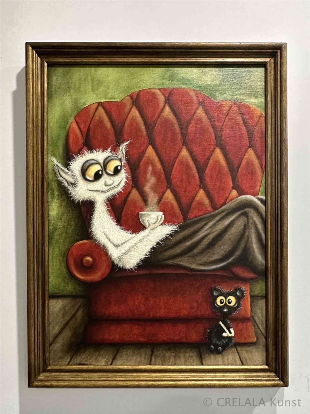 Am Ende nimmt man einen humorvollen Blick auf das menschliche Treiben mit nach Hause, den die "Dust Bunnies" von Nicole Gerst verursachen. Wollmäuse, die Staub-Flaum-Cluster in Räumen, die man vernachlässigt hat. Wie die Pflege von Beziehungen, oder Freundschaften, die hinter der Arbeit vergessen werden, Während Zeit voranschreitet. Und dann bringt ein Staubflaum - Monster mit dem Titel "Schwesterherz" zum Grübeln. -Herz? (Mit oder ohne t? Wie war das doch gleich?) - Schwester? roter Plüschsessel mit Knöpfen, in Sektoren trennend, wie Kissen, quasi einzelne Zellen, am Knopf-Punkt zusammengehalten, gebunden. Das kleine Monster in weiß unter brauner Decke, vor grüner Wand, nicht sitzend, eher quer liegend, die Ohren gespitzt, mit Tasse in der Hand, Vielleicht Tee, vielleicht Kaffee, man weiß es nicht so genau. Das kleine Schwarze ( auch ein Monster?) zu Füßen, verbunden am linken Arm (aus seiner Sicht. - Schaut man darauf, liegt der Verband rechts. - Alles eine Frage der Perspektive...) schielt glubschäugig versehrt. Verwirrt? - Sicher ist, die Augen beider sind SEEEEEEHR groß! Und gelb! -Bei allen Dust Bunnies in ihren schweren Goldrahmen