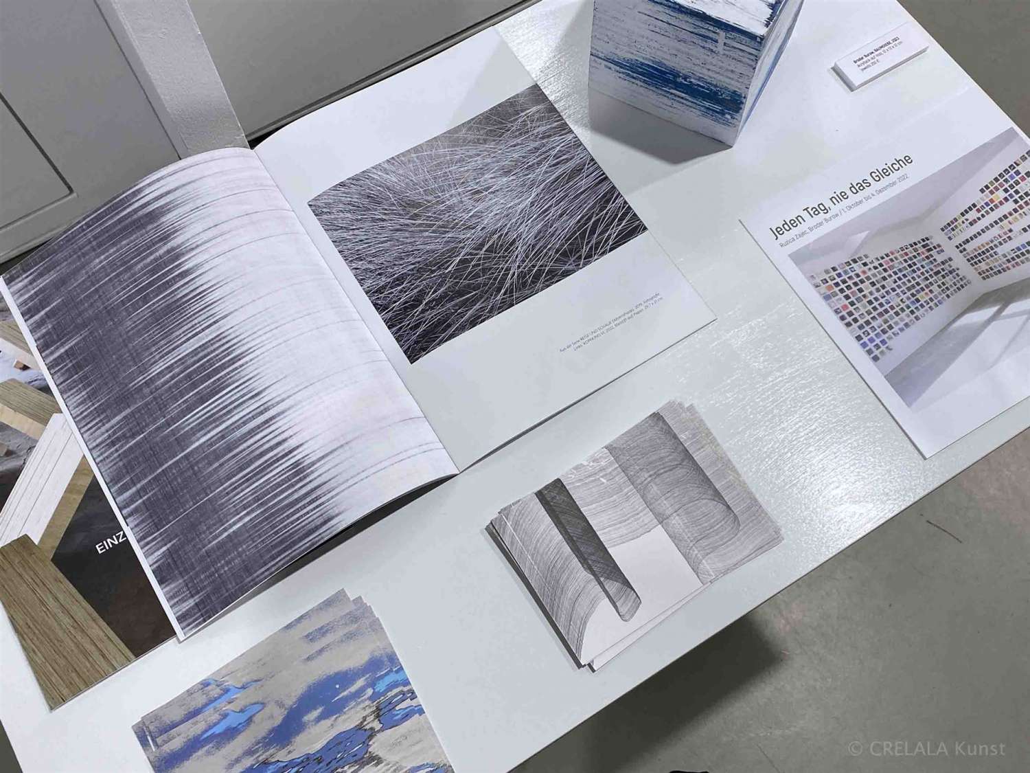 Was geht dem Mann durch den Kopf beim Sortieren, wie funktioniert das Gehirn beim Arbeiten? Denken? Wenn es sortiert und zurechtrückt, in Schubladen ablegt, Boxen, Containern, Hirnwindungen und vielleicht Falten, und wie kann ein optimales System aussehen, welches das Hirn managen muss, um jederzeit wieder an die Informationen zu kommen, die in den Containern, den Taschen, den Hirnwindungen, Falten irgendwo; abgespeichert werden? Broder Burow / Ruzica Zajecs Bleistiftlinien auf Papier können quergedacht Inspiration zur Erklärung geben, wohin man überall wegsortieren kann. Entfernt erinnernd an hygroskopische oder seismografische Diagramme von übereinander lagernden Ebenen von Stillstand, nur gewunden, und der Ebene durch Rollung, Windung, oder Faltung entzogen, könnten sich Informationen in Zwischenebenen verbergen, wie man es aus der Gebirgsfaltung kennt. Im Anschnitt wird sichtbar, was auf den ersten Blick noch verborgen ist. Wie engmaschig kann man zusammenfalten? Spielen die Schichtscheitel eine Rolle? Die Wendepunkte? Beim Parabelflug hat man vom Moment der Schwerelosigkeit am Scheitelpunkt gehört… Kann man das menschliche Gehirn analog betrachten?