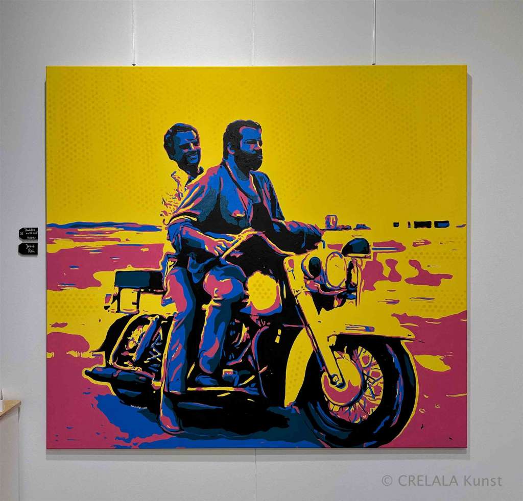 Wer erinnert sich noch? Bud Spencer und Terence Hill? Gehört Mediengeschichte zur Ausbildung dazu? Und warum sollte eine junge Generation sich noch der alten Helden erinnern? Wer würde heute eine Büste von Cäsar aufstellen, oder eine Säule von Marc Aurel? Jakob Reh ist Lehrer. Und Künstler. Und er erzählt von seinen Schülern, die ihm begeistert folgen, wenn er seine Positionen als Künstler präsentiert. Auf der INCorporating Art Fair ist er nur mit einem Bild vertreten, dafür aber mit zwei Mappen voller Drucke. Und hier findet man ein Abstrichblatt. Mit Bud Spencer! Man muss zweimal hinschauen, erinnert sich an das alte Grundschülerspiel „Schau genau“. Und man begreift!