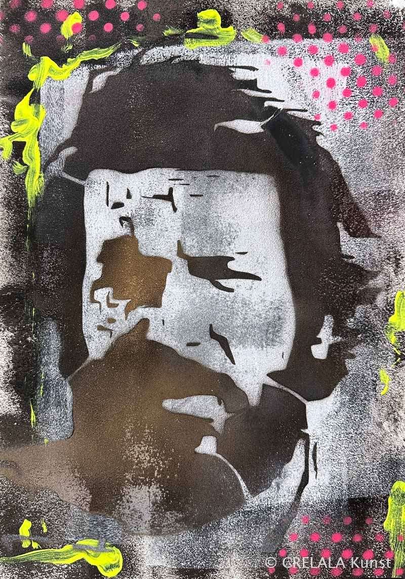 Katja Nordmeyer hat das Lochblech als Mal-Medium für sich entdeckt. Sie trägt auf den Lochblechen Farbe auf, die am Ende durchtropfen wird. Nicht vollst ändig, aber doch partiell. Und es wird ein Druck entstehen, der in Ansätzen veranschaulicht, wie Siebdruck funktioniert. Nicht durchgepresst, nicht durchgestrichen, sondern einfach durchgetropft. Ihre Frauen sind Persönlichkeiten. Erhabene, die das Durchtropfen überlebt haben. Das Durchwirken überlebt haben. Geblieben sind. Neue Gedanken treiben Blüten, neue Ideen, neue Impulse, aber die Wiederstandsfähigkeit hinterlässt Spuren . Ernste Gesichter, von Persönlichkeiten mit Strahlkraft! Schönheiten!