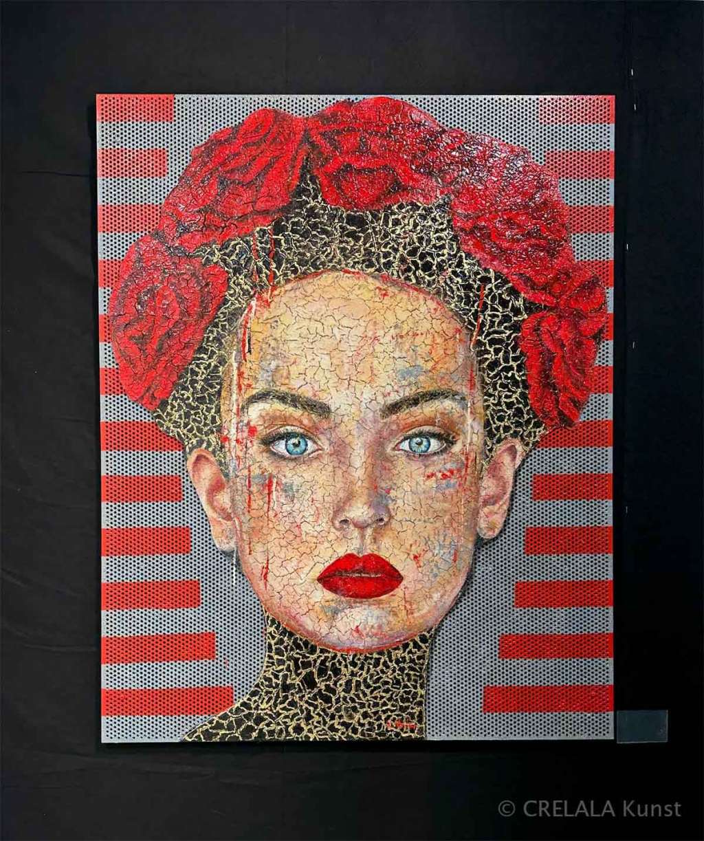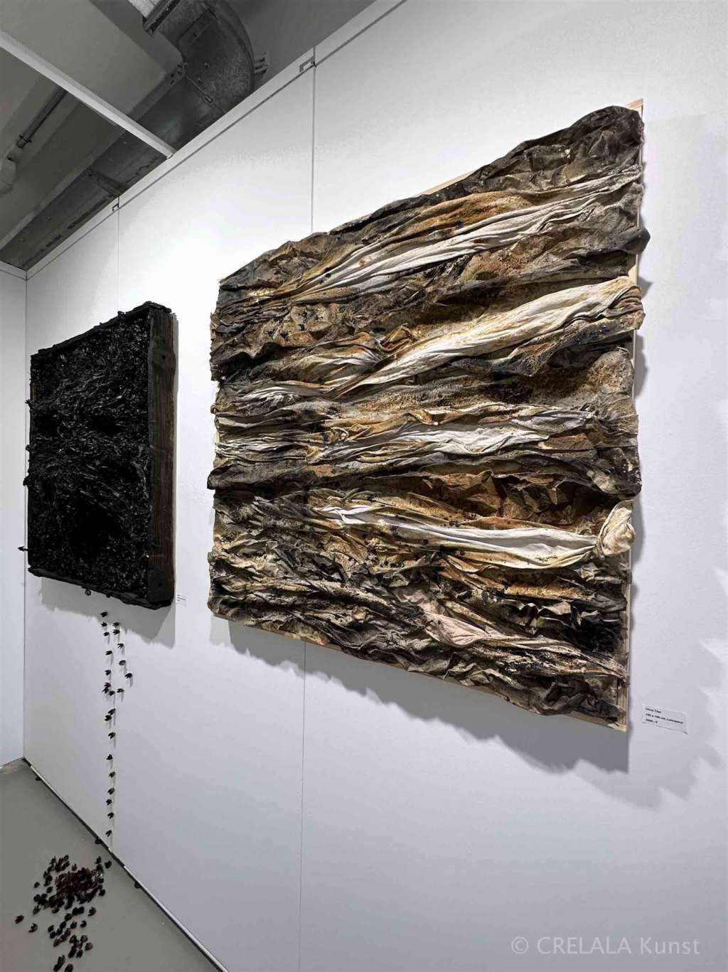 Und das Profil einer fremden Göttin beweist: Mensch sucht Perfektion! Schmuck und Ansehen, Jugend und Schönheit, von Katja Nordmeyer in Szene gesetzt, als gäbe es nichts Wichtigeres auf der Welt! Aber das Lochblech, und das Trocknen, während die Tiefe nach unten zerrt, die Trocknung zu Rissen führt, hinterlässt bleibende Schäden. Nur ein Experiment zu Restaurationsbewältigung? Spannend zu beobachten, wie ein ums andere Mal bei Katja Nordmeyer neue Gesichter auftauchen. Welche Geschichten stecken dahinter? Spielt es eine Rolle? Den Art-Collector kümmert´s.