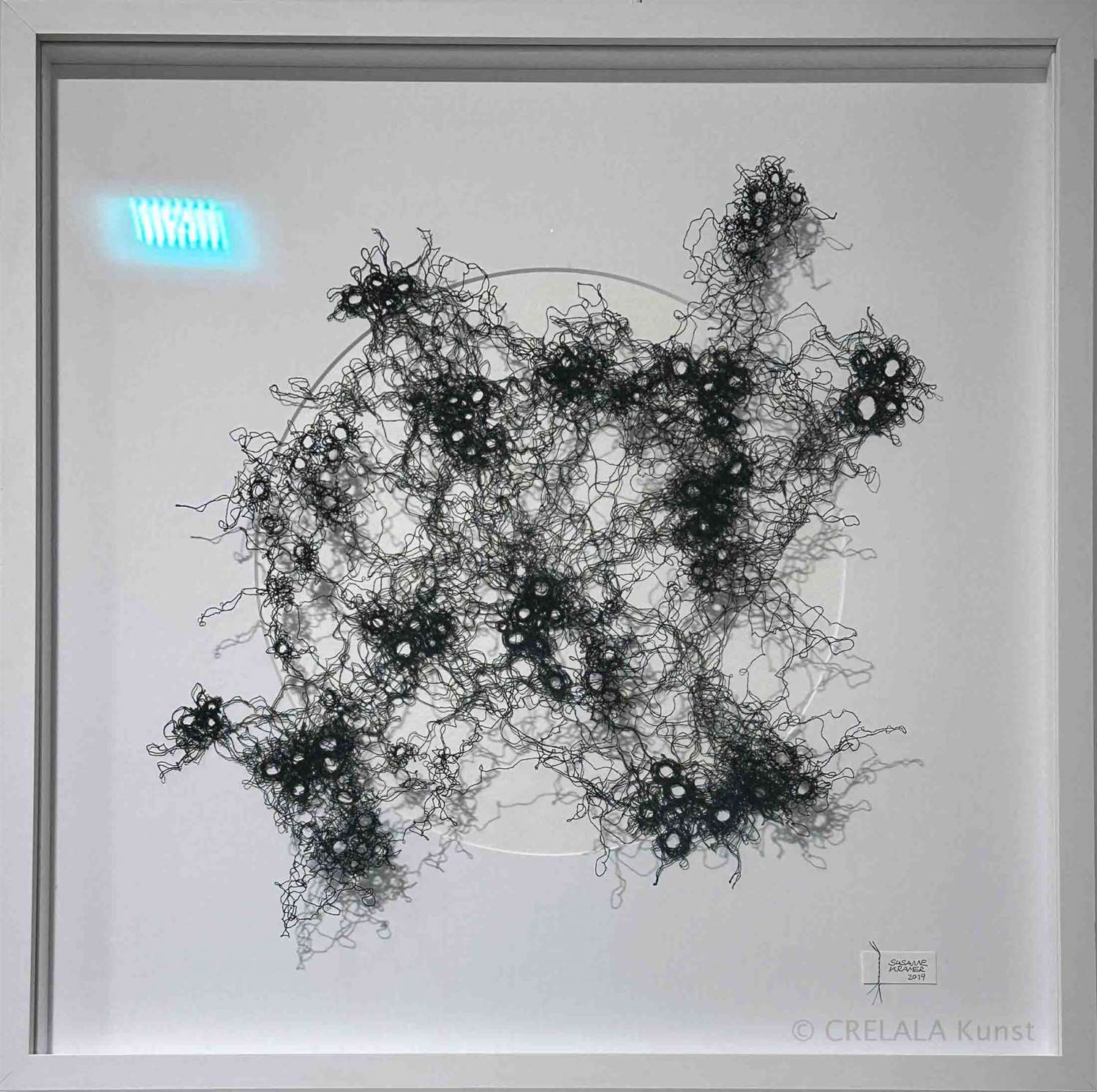 Susanne Kramer clustert mit Garn! Sie näht. - Näht Kunst! Und sie spielt mit dem Licht, das schließlich auf und durch ihre Kunst fällt. Und sie visualisiert, dass die Schatten sich mit der Materie mischen und zu scheinbar größeren Clustern werden. In der Wahrnehmung deutlich schwerer vermutet, als wahrhaftig gewichtet, denn Schatten ist… ja was eigentlich ist Schatten? Hat Schatten Gewicht?