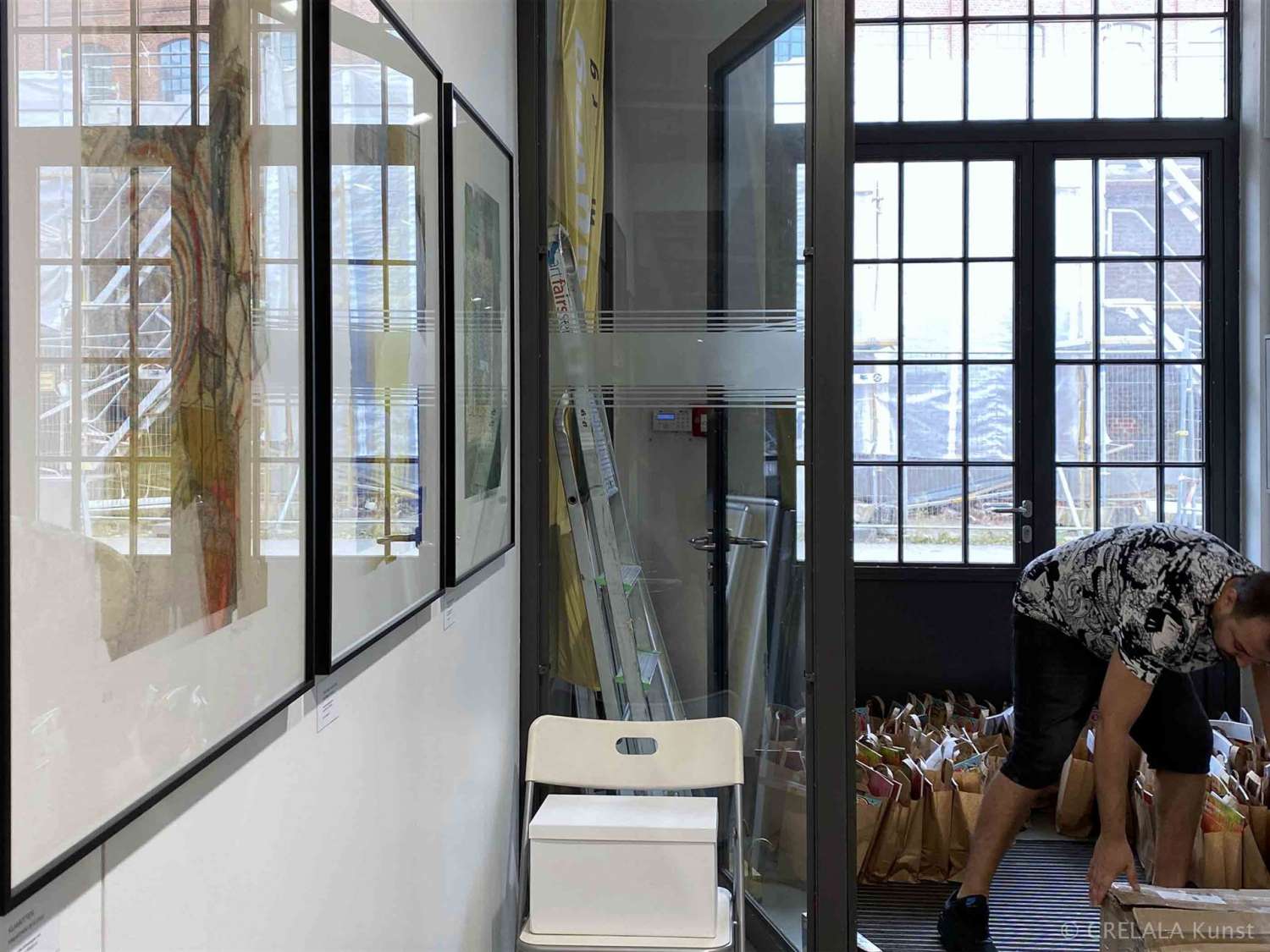 Es wirkt fast verzweifelt, wie er da so die Taschen sortiert, die „giveaways“ für die Künstler. Die „gimmicks“! Fast schon ein Kunstwerk selbst. Konzeptuell.