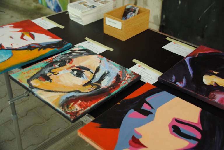 Um 16:00 Uhr findet die Benefiz-Auktion von gespendeten Kunstwerken der Künstler Sonja Denzer, Dr. Blanca Mandel, Peter Frick und Simone Labonté in einer Amerikanischen Versteigerung durch Thorsten Sommer (von KWCMP) und Peter Labonte, (Onkel der CRELALA Schwestern) statt. Es wird in 5 Euro-Schritten gesteigert und es kommen mit den Spenden der Sponsoren Weingut 8 Ettari, GGEW, Sanitätshaus Mitterle und einiger
