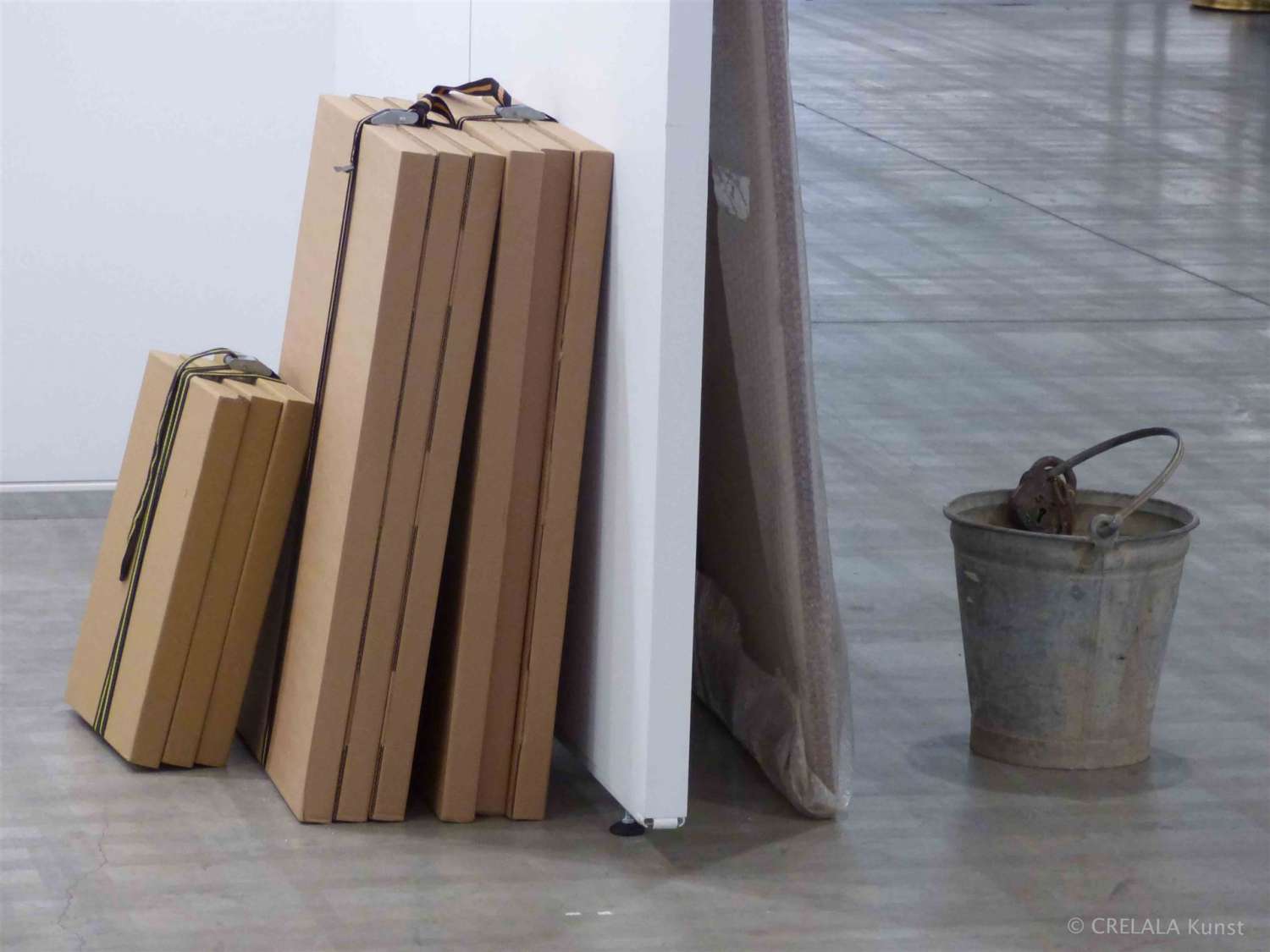 Die gut eingepackten Kostbarkeiten werden aus den Transportern geladen, Rollwagen, Transportboxen, Rollkoffer und Kastentransporter surren hinter den Akteuren her, überall stehen Leitern und Werkzeugkisten, liegen Wasserwaagen und Zollstöcke, es wird gemessen, gebohrt, und gehämmert,… genagelt und geschraubt,… Kisten mit Arbeitsmaterial und Luftpolsterfolie, Umverpackungen und Pappe, Kartons und Boxen werden zu raumgreifender Kulisse, und die Kunstschau nimmt allmählich Formen an. Die Caterer beliefern, stellen Bänke und Tische, und es wird an allen Ecken und Enden gewerkelt und geschrubbt. Ein Profisauger saugt noch schnell die Arbeitsspuren der Messebauer aus Ritzen und Ecken, und über die wenigen Stunden bis zur Eröffnung füllt sich der Raum allmählich mit Inspiration.