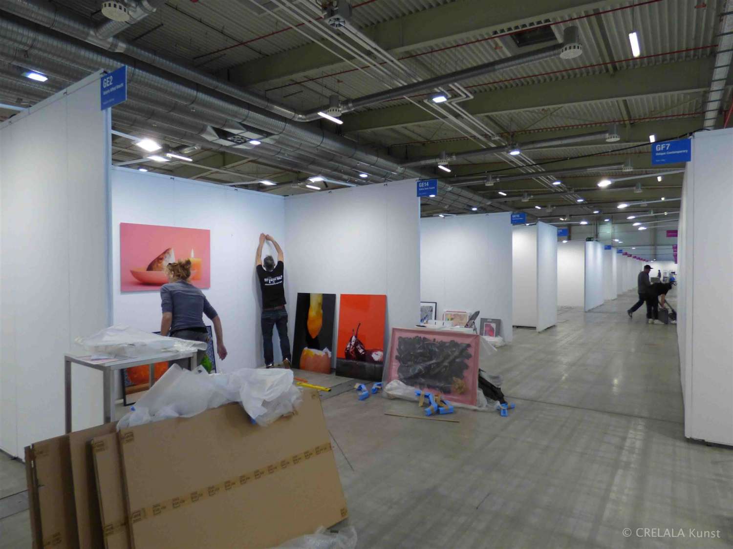 So manches Arbeitsumfeld wird selbst zum Kunstwerk, noch bevor die Kunst aufgebaut, oder gehangen ist,…, ja, gar die vorbereiteten, leeren Kojen selbst wirken im Licht der Sonne oder den Spots an den Stellwänden, bzw. am Hallendach, wie Kunst. - Als läge der Atem der Kunst selbst über den Kojen.