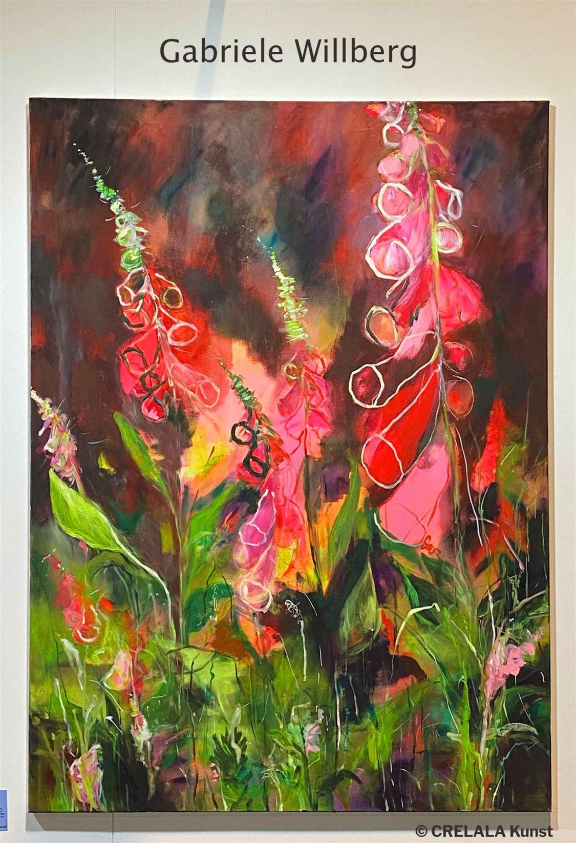 Fasziniert, grübelnd, sinnend, ... die Kunst hält viele Adjektive und Adverben parat und man kann von Freude, über Schmerz bis Traurigkeit alles finden. Manchmal ist man gerade von einem Kunstwerk angezogen, dann fällt das Werk daneben ins Auge und als würden die Bilder, jedes auf seine eigene Weise, leben, „ruft“ plötzlich ein Werk. Nicht dass es wirklich rufen würde, aber so lässt es sich am ehesten in Worte fassen. Bilder in Worten. - So ein Ruf eines Bildes geht von „Digitalis“, dem Werk von Gabriele Willberg aus, das eine Farbmagie mitbringt, wie die Werke, an die man sich erinnert. Die bleibenden Eindruck im Gedächtnis hinterlassen haben. Vielleicht beschreibt die Begegnung des Odysseus mit den Sirenen bei seinen Irrfahrten am Besten, was gerade passiert. Die Macht der Farben kommt einem Wispern gleich. Das Gift der kostbaren Schönheit kann tödlich sein, wenn nicht richtig dosiert. In unendlicher Verdünnung ist es ein Heilmittel. - Das strahlende Leuchten zieht in den Bann.