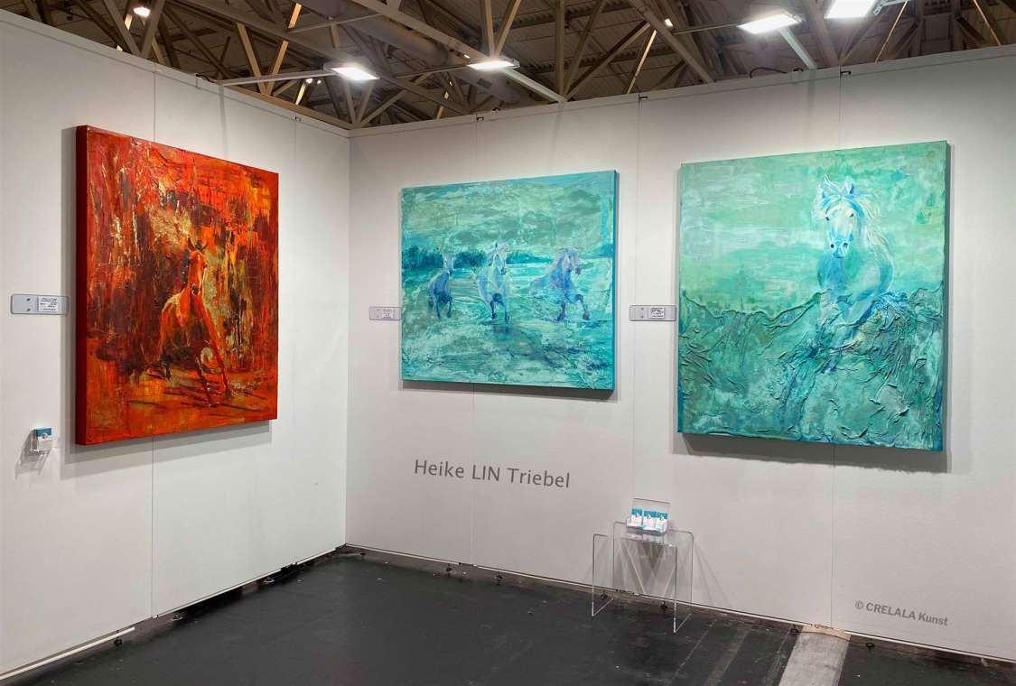 Tiefgang, den auch die Wilden Pferde von Heike LIN Triebel haben, die den Fluten eines türkisfarbenen Ozeans entsteigen. Aus Meerschaum in Gaze. ... Wilde Pferde! Sinnbild für Freiheit! Ungebundenheit! Unbezwingbarkeit. Eine eigene Erinnerung an Wilde Pferde wird wach. An einer Decke. Damals nur eine Skizze. In Bleistift. Auf der anderen Seite der Welt. Und nur für jene zu sehen, die den Blick heben. Wie aus einer weiteren Erinnerung. An die weißen Pferde der Camargue. Oder schwarze Mustangs im Wilden Westen. Und plötzlich ist man geistig bei Erdkunde. Dem Schulfach, in dem man von einem charismatischen Lehrer etwas über Passatwinde und Rossbreiten lernte. - Rossbreiten, in denen bei Windstille die Überfahrt in die Neue Welt zum Stillstand kam und so viele ihr Leben lassen mussten. Menschen, wie Pferde, die dann über Bord geworfen werden mussten, um Seuchen zu verhindern. Und dann ist man wieder bei Heike Lin Triebels Pferden im Meer. - Pferde, die aus Meerschaum geboren werden. Welche Kraft, welche Magie. Ein magischer Moment entsteht, die Phantasie lodert auf. Das Rauschen des Meeres und das Aufschlagen der Wellen auf den Strand, gebrochen vom Schnauben geblähter Nüstern und einem Wiehern, das sich im Wind verliert. Nicht unerwähnt bleiben sollte das rote Pferd. Ist es Hengst, oder Stute? Die Neugier ist geweckt. Warum denkt man unmittelbar an Hengst? Es ist nicht recht erkennbar. Man hat vergessen zu fragen, verschiebt es aufs nächste Mal, denn den Namen Heike Lin Triebel wird man sich merken. - Ihre „Wild Horses“ werden nicht mehr vergessen.