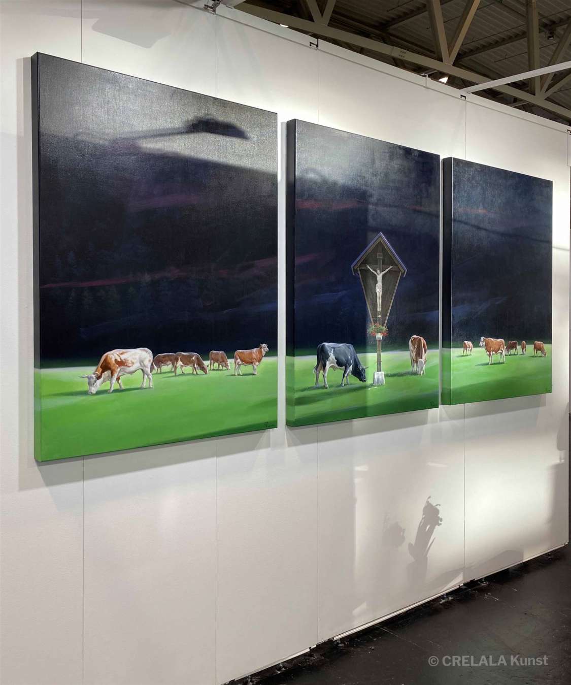 Tiere waren auf der discovery art fair in Frankfurt verhältnismäßig wenige zu bestaunen. Obwohl. Da gab es bei InGallery, einer Adresse in Moskau dieses Bild einer Kuhweide mit weidenden Kühen, wie man es aus dem Allgäu gewohnt ist. - Ein Triptychon. In der Mitte ein Christuskreuz, daneben 1 schwarz-weiß gefleckte Kuh, die anderen 11 Kühe Abstufungen von braun-weiß-gefleckt. Das Grün wie ein Fußballrasen, der nachtschwarze Himmel mit Schemen von Wald dahinter, wie eine Platte am Feldrand aufgestellt. - Kunst kann so faszinierend sein. Es ist immer wieder eine Freude zu beobachten, wie Künstler die Welt wahrnehmen.