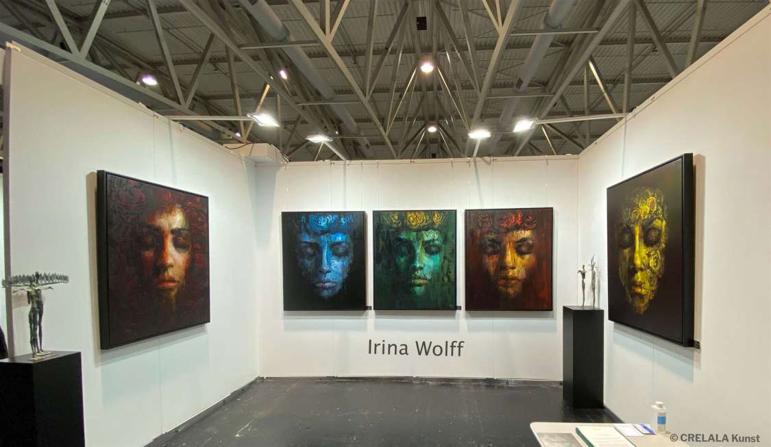 Irina Wolff präsentiert „Weisheit“ bis „Anderssein“, so die Ankündigung der Messe, Titel im Flyer: „Nacht“. Lässt man Titel ohne Bild wirken kann die Phantasie unendlich viele Möglichkeiten der Darstellung bieten. Irina Wolff hat sich für Köpfe entschieden. Sphinxen gleich, mit geschlossenen Augen. Man denkt an die Unendliche Geschichte, in der Atreju durch das Südliche Orakel schreitet. Die scheinbar Schlafenden vor dunklem Hintergrund, nur vage erkennbar. Makellose Gesichter mit weiblicher Attitüde und aufgeblühten, ja fast schon verblühten, Rosen geschmückt. Würde man ein einziges Wort zur Beschreibung der vier großformatigen Porträts in dunklen Tönen suchen, es fiele einem MYSTIK ein.