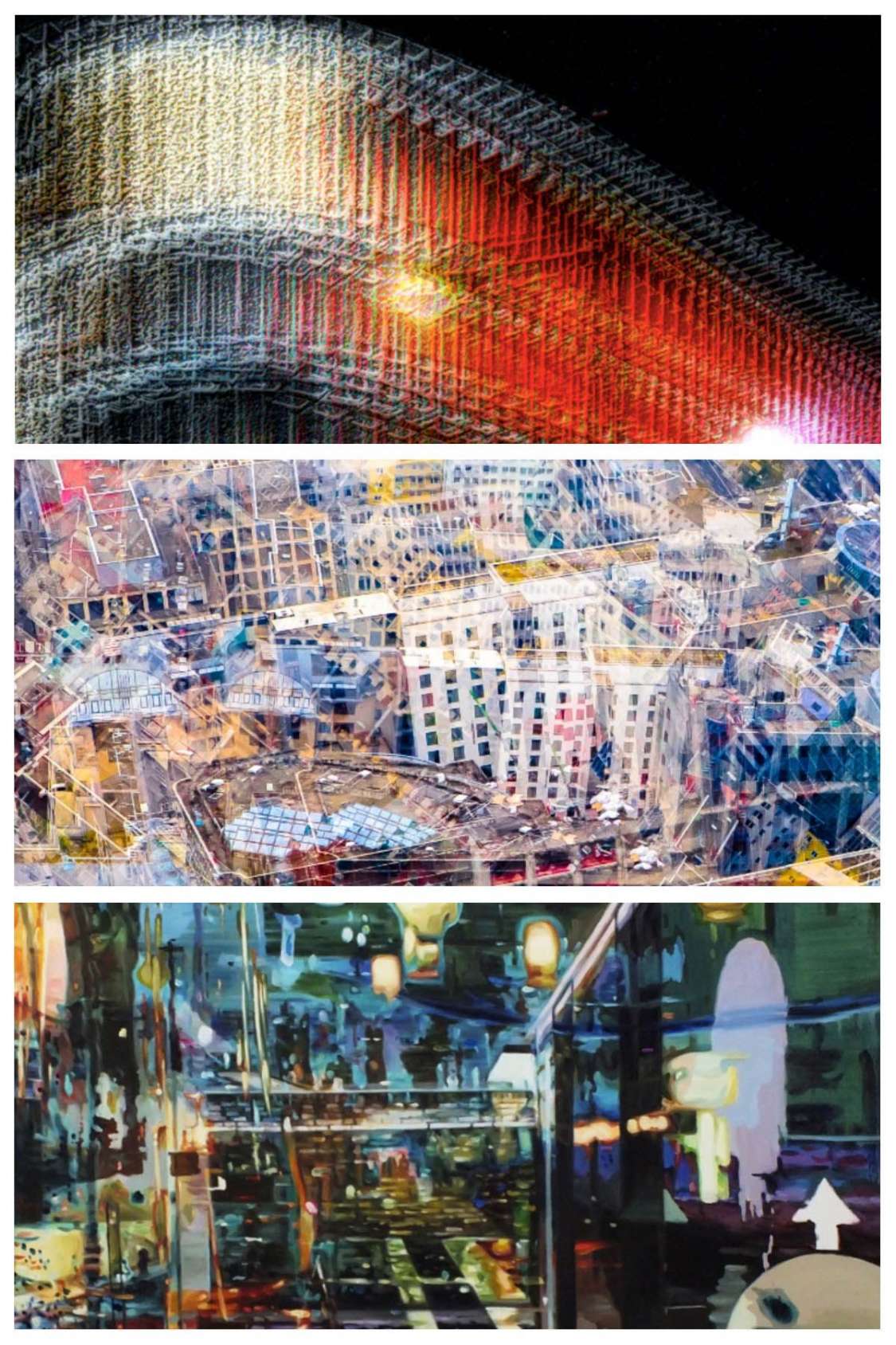 Das Gestern scheint in Auflösung. Reinhold Adscheid präsentiert „Nightshopping“ diffus unscharf, Katrin Sandmann-Henkel inszeniert Frankfurt, wie bei einem Erdbeben, und Hyeja aus Seoul zeigt eine verlassene Oranienstraße, in der das bunte Treiben, das schnellebige Nachtleben fehlt. Übrig bleibt das Leuchten der Stadt und die damit verbundene „Lichtverschmutzung“. Wozu Licht, wenn die Menschen nicht mehr auf den Straßen sind? Nicht mehr auf die Straßen dürfen? Können. - Das Wort LOCKDOWN taucht im Geiste auf. Lockdown und Corona. - Hikikomori passt dazu. Japanisch: „sich einschließen“ oder „gesellschaftlicher Rückzug“, laut Wikipedia: HIKIKOMORI.