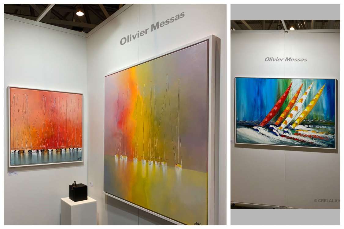Paradiesisch erscheinen einem die Werke von Olivier Messas. Aus der Serie Esprit Voile von 2019 sind die farbstarken Gemälde über das Segeln. Schnell und voller Energie nehmen einen die Einmaster mit. Die Segel aufgebläht im Wind, bevorzugt in gelb, rot, oder weiß, mit starken Werkstiteln wie „Un vent de liberté en mer“. Kraftvoll und ruhig dagegen die abgetakelten Masten, die still auf dem spiegelruhigen Wasser liegen. Die Segelform als Andeutung dargestellt, durch die der Himmel dahinter als Ganzes nicht durchbrochen wird. Die Magie der Farben beflügelt die Fantasie und die Spiegelungen laden zum Träumen ein. Messas kann kraftvolle Ruhe genauso stark umsetzen, wie energiegeladene Bewegung. In seiner Serie Expression Libre von 2020 arbeitet Massas fragmentiert. Wie aus Blütenblättern oder bunten Federn erschafft er einen Schwarm aus Farben, der am Ende seine Gestalt durch die Verteilung der einzelnen Elemente erhält. Eine Mystik ganz besonderer Art.