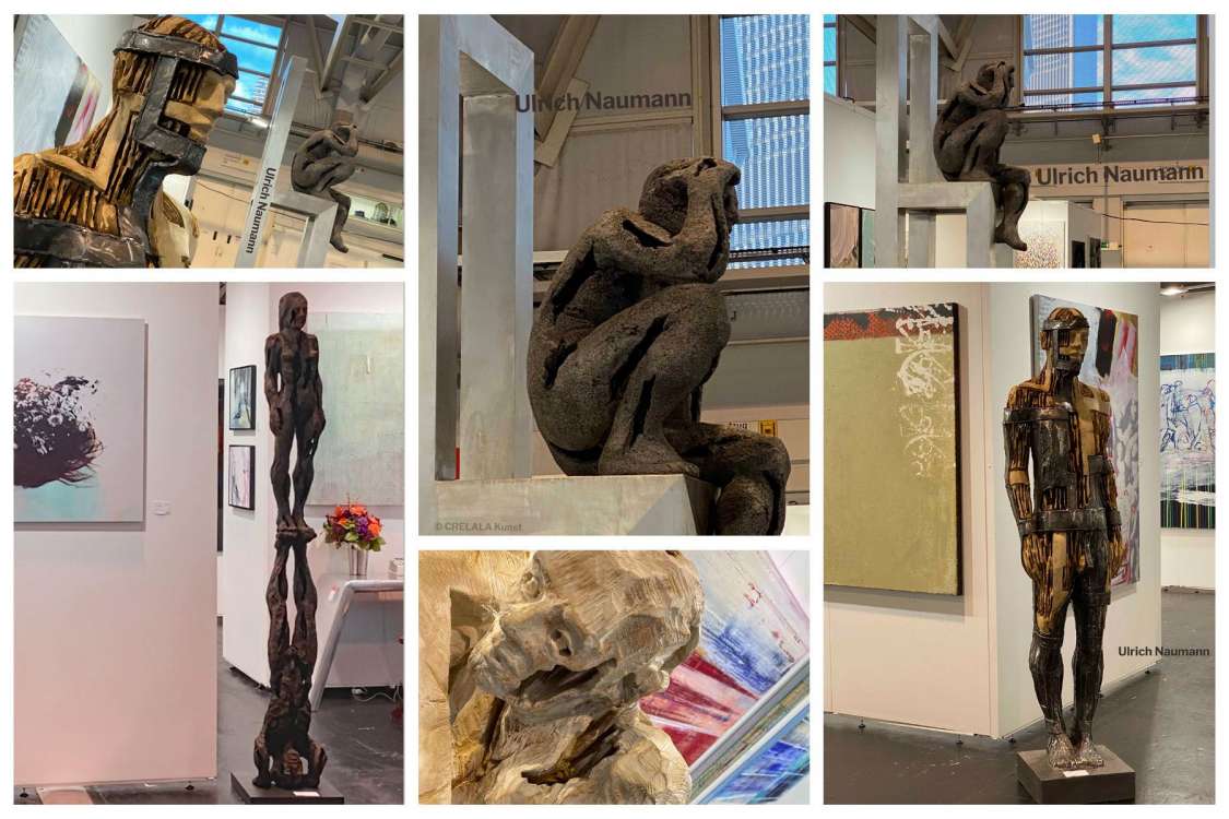 MYSTIK! Da ist es wieder dieses Wort, das die Kunst erfunden haben könnte. Mystisch wirken auch die Skulpturen des Künstlers Ulrich Naumann, ausgestellt von der Galerie art2you. Naumann hat bizarre Kreaturen mit Holzkern erschaffen. Vielleicht Männer, vielleicht spielt es auch gar keine rolle, ob Männer oder nicht, löchrig, teils durchsichtig, teils massiv, bisweilen bandagiert, mit Metall, eine finstere Assoziation heraufbeschwörend und das „Schweigen der Lämmer“ kommt einem in den Sinn. Der Galerist erklärt: Der Künstler überlässt dem Betrachter die Interpretation selbst. „Soll doch jeder denken, was er will.“ „Leben und leben lassen“ hatte noch vor kurzem ein anderer, großer Künstler aus Fernost betont. Wenn Künstler etwas erschaffen, verlieren sie sich manchmal so sehr in ihrer Arbeit, dass sie mehr als nur das handwerkliche Geschick zeigen. Sie stecken all ihr Herzblut in die Arbeit, ein Teil der Seele bleibt zurück und ihre Gedanken streifen das, was die Augen sehen, in der Gefahr vom Gegenüber eingeschlossen zu werden, wie in einem Horkrux. Ulrich Naumanns Skulpturen haben Kraft! Und gleichzeitig zeigt er, wie hilflos man sich manchmal fühlen kann. Ein Verzweifelter hoch oben macht deutlich wie dünn die Luft in der Höhe sein kann.