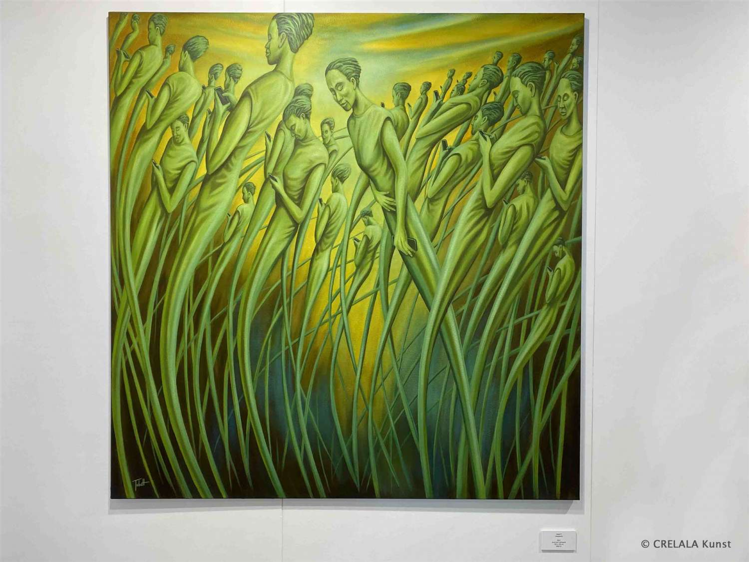 Zum ersten Mal registriert man die Arbeit von Uwe Tabatt. Es ist nur ein winziger Augenblick und ein Blick auf ein Grasfeld, aus dem Menschen, vertieft in smarte Geräte, entwachsen. Raum und Zeit lösen sich auf und nichts mehr hat Bedeutung. Eine geisterhafte Verbindung , Verknüpfung, Verlinkung baut sich auf und Uwe Tabatt reißt einen mit.